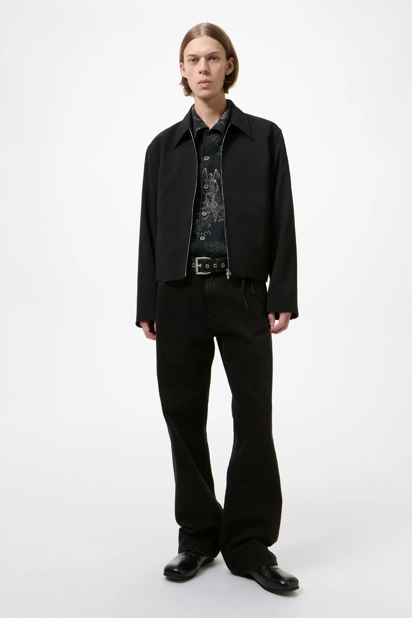Giacca nera di Our Legacy in lana modello camicia con colletto classico, chiusura frontale con zip e tasche laterali.