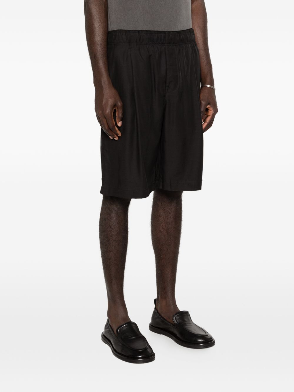 Pantaloncini neri Leisure di Our Legacy in cupro con vita elasticizzata, tasche lateriali e orlo dritto.