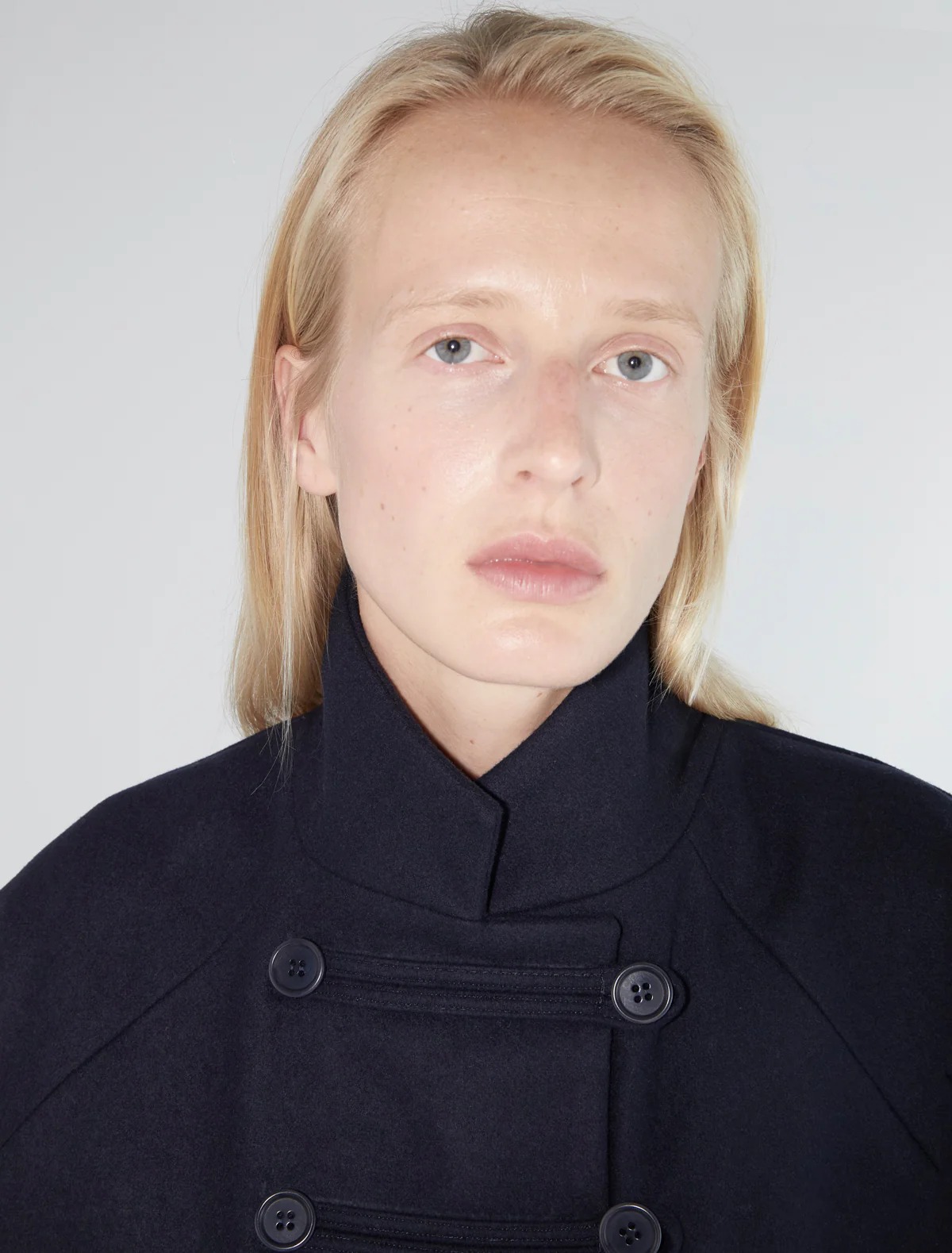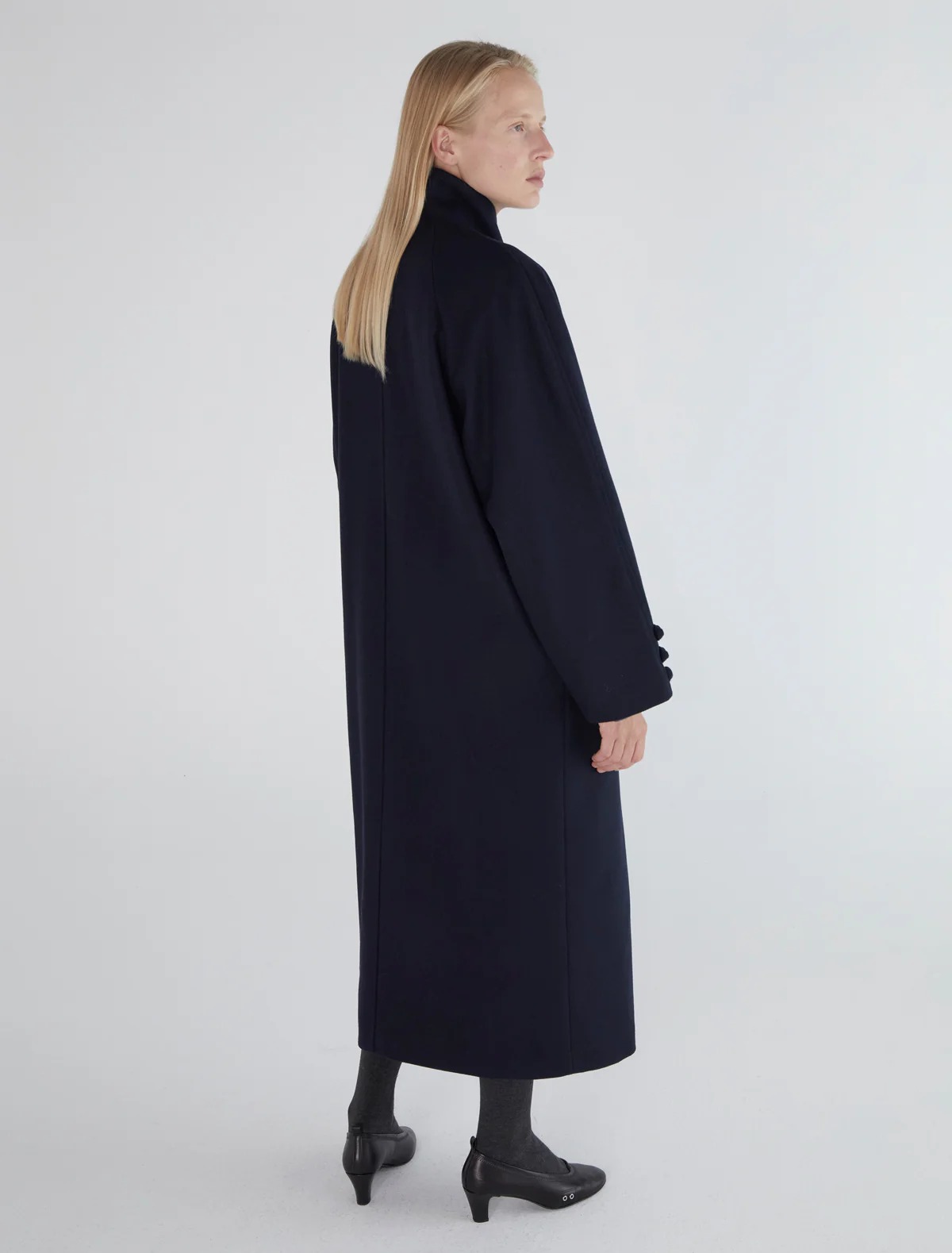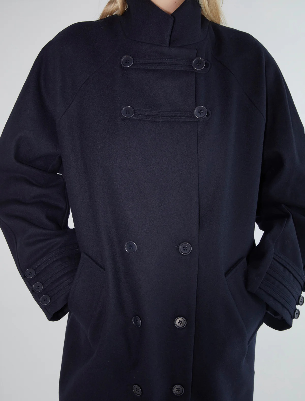 Cappotto navy Debo di Paloma Wool in lana con chiusura frontale con bottoni, oversize in stile trench, linguette abbottonate sui polsini e sul bottone superiore.