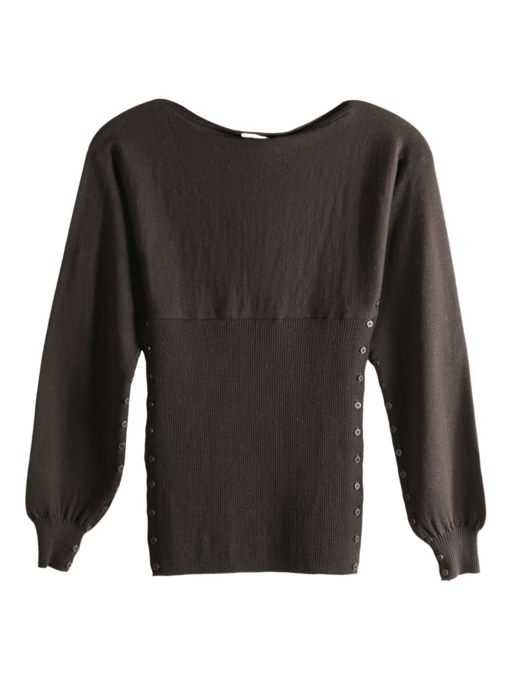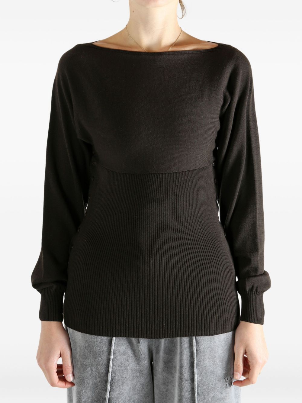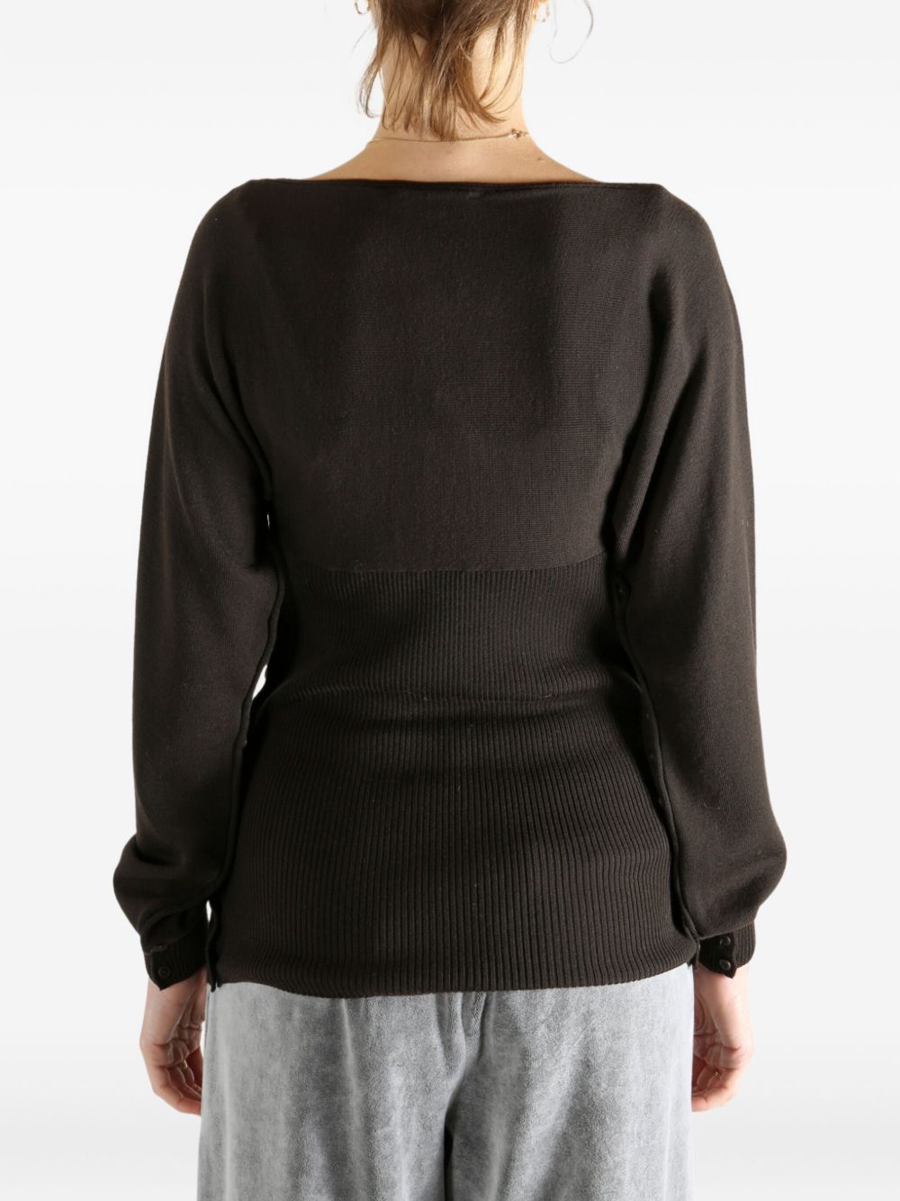 Top marrone Fa di Paloma Wool in lana con scollo ampio, abbottonatura laterale asimmetrica e maniche aperte.