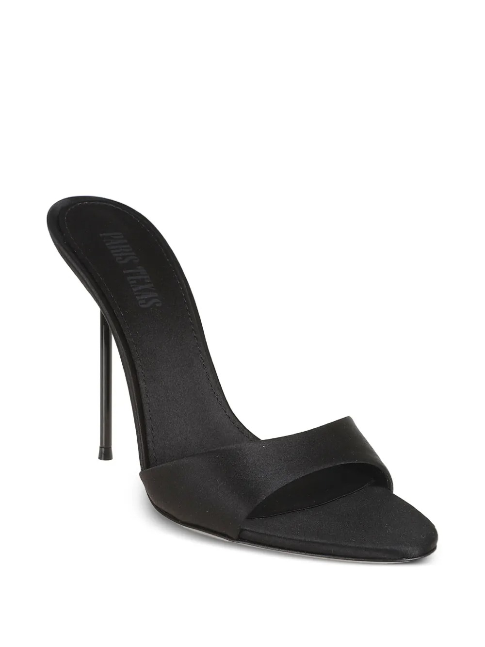 Sandali neri Lidia Mule di Paris Texas in raso con tacco a stiletto e punta aperta.
