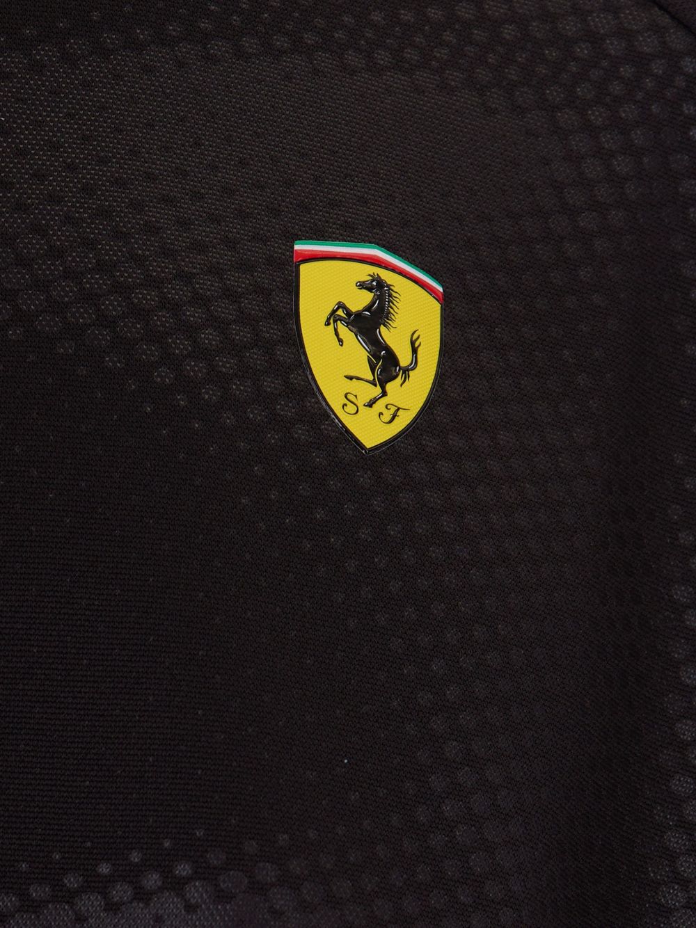 Giacca nera T7 di Puma x Ferrari in poliestere com chiusura frontale con zip, maniche lungfhe e orlo e polsini elasticizzati.