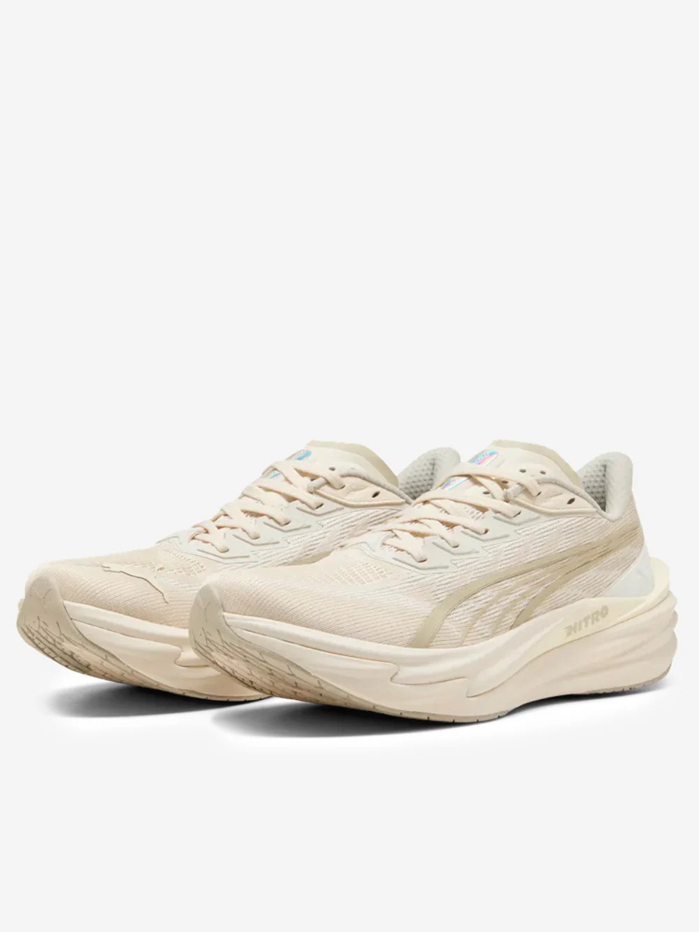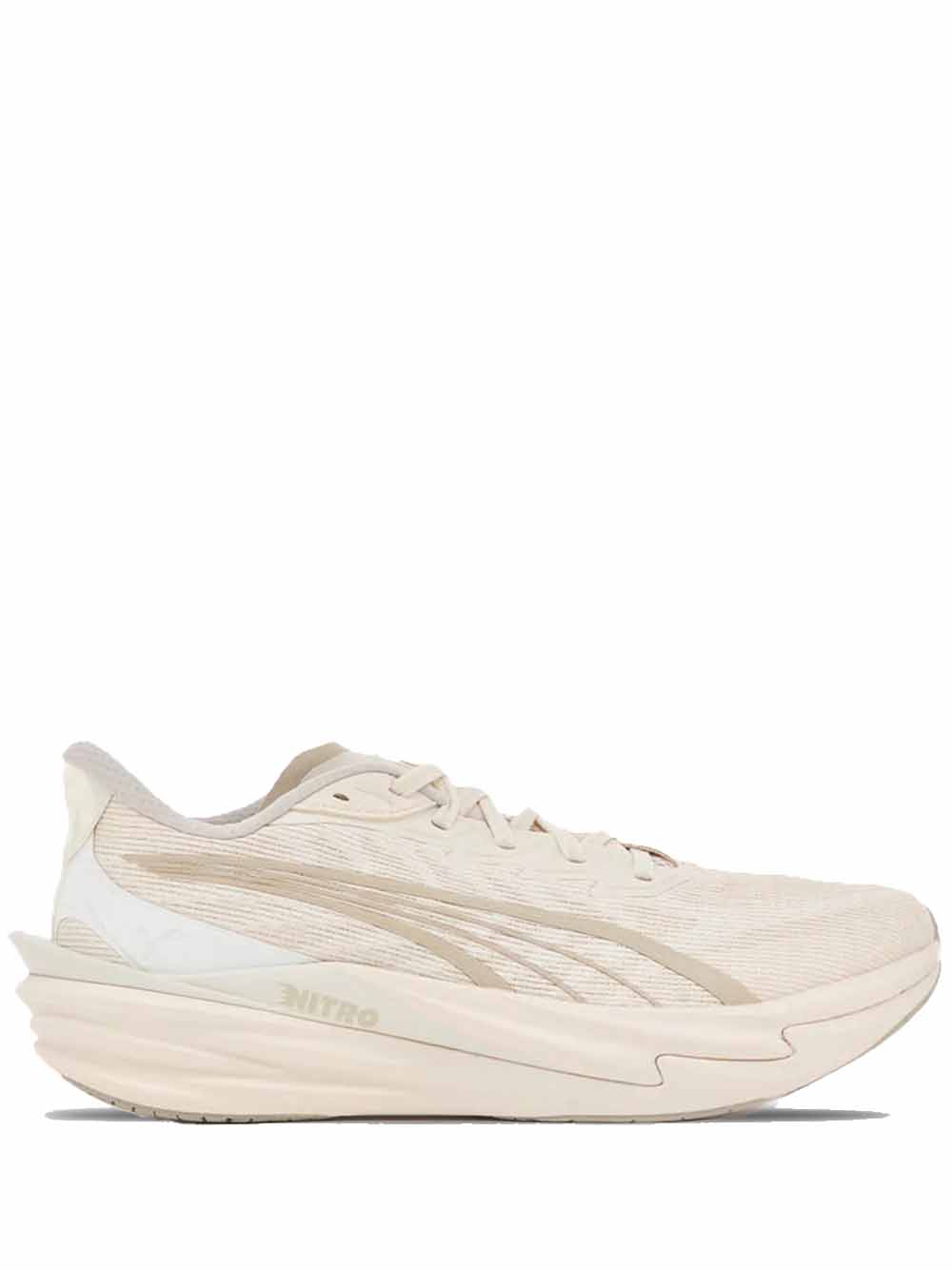 Sneakers bianche Deviante Nitro 4 di Puma in tessuto con punta a mandorla, suola alta e ricami laterali.