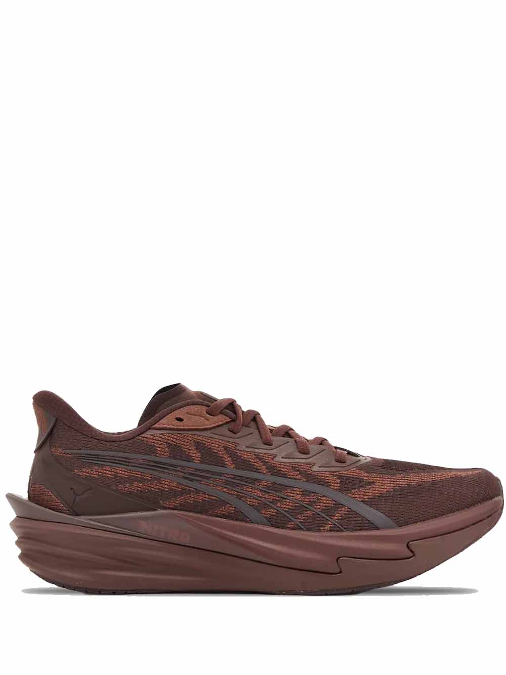 Sneakers marroni Deviante Nitro 4 di Puma in tessuto con punta a mandorla, suola alta e ricami laterali.