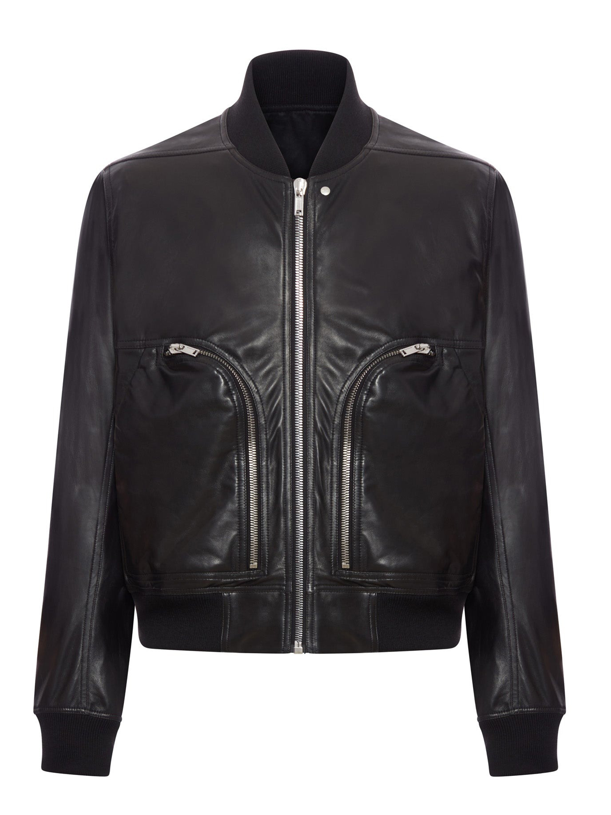 Giacca nera Bauhaus Flight di Rick Owens in pelle chiusura frontale con zip, tasche cago con zip e orli in tessuto elasticizzato.