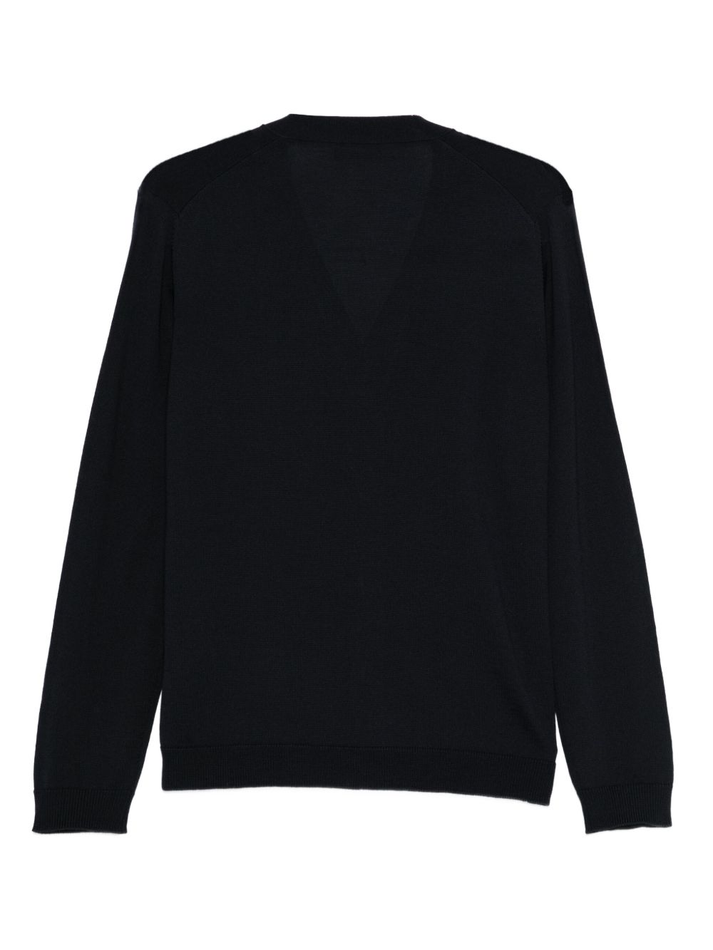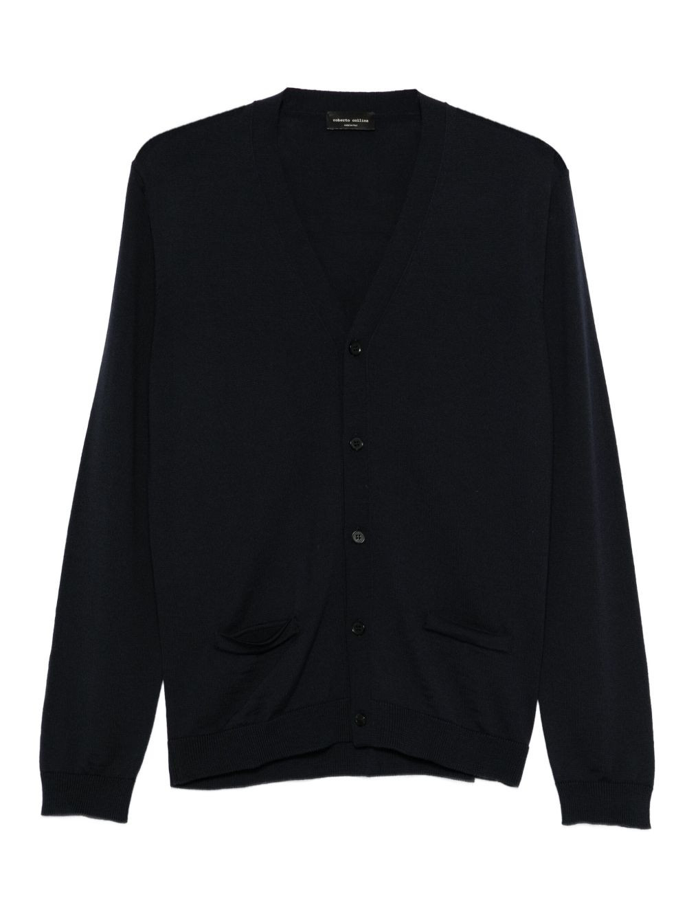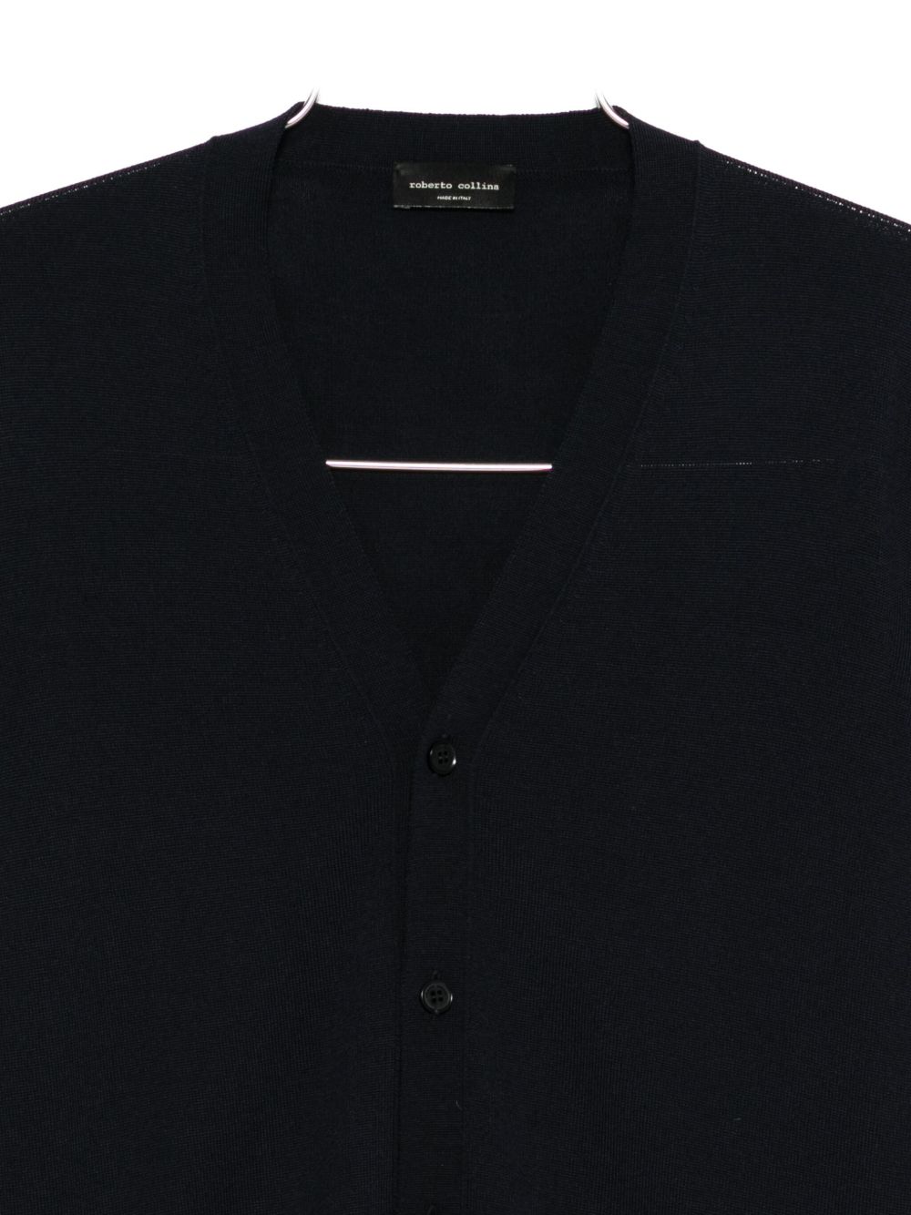Cardigan navy di Roberto Collina in lana con scollo a V, chiusura frontale con bottoni, maniche lunghe e orlo dritto.