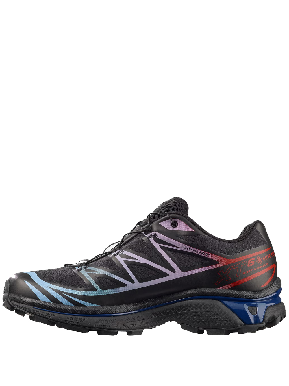 Sneaker nera XT-6 di Salomon in GORE-TEX® con dettagli termosaldati, chiusura con coulisse, punta tonda, fodere in tessuto e suola texturizzata in gomma. Completano il design l'etichetta logo applicata sullla linguetta e il logo stampato lateralmente.