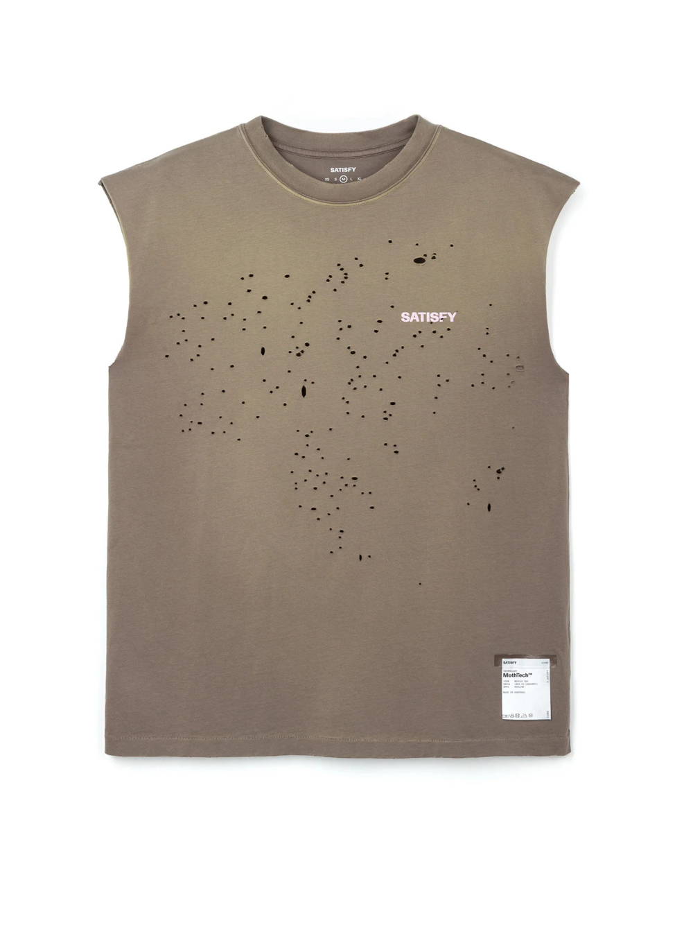 T-shirt beige scuro di Satisfy in cotone organico con girocollo, design senza maniche, stampa laterale, etichetta a vista e orlo dritto.