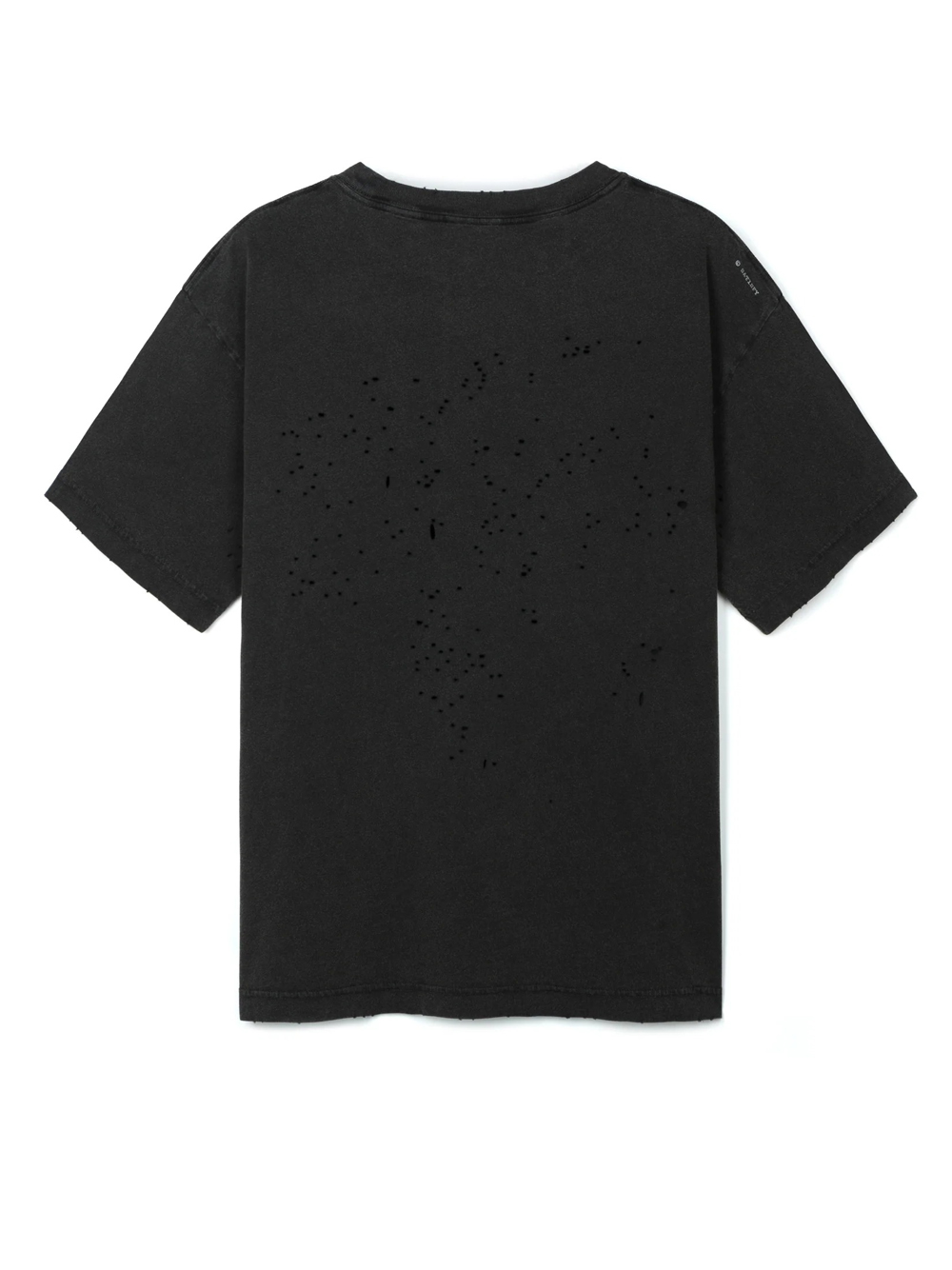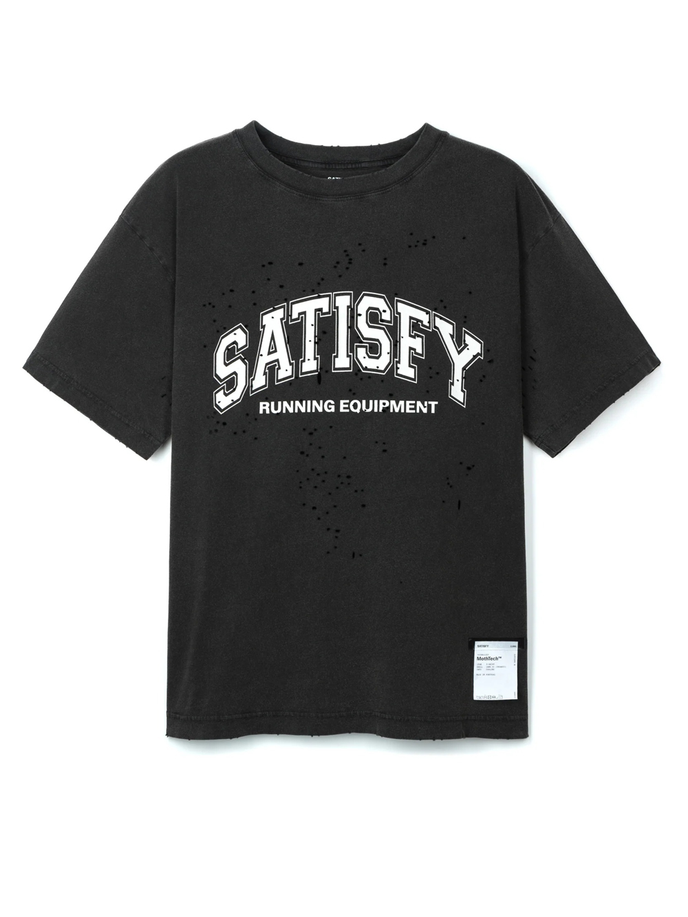 T-shirt nera di Satisfy in cotone organico con girocollo, manica corta, stampa frontale, etichetta a vista e orlo dritto.