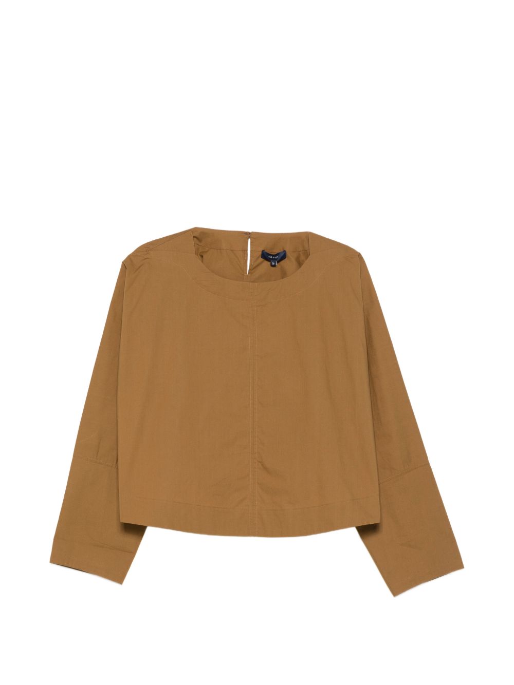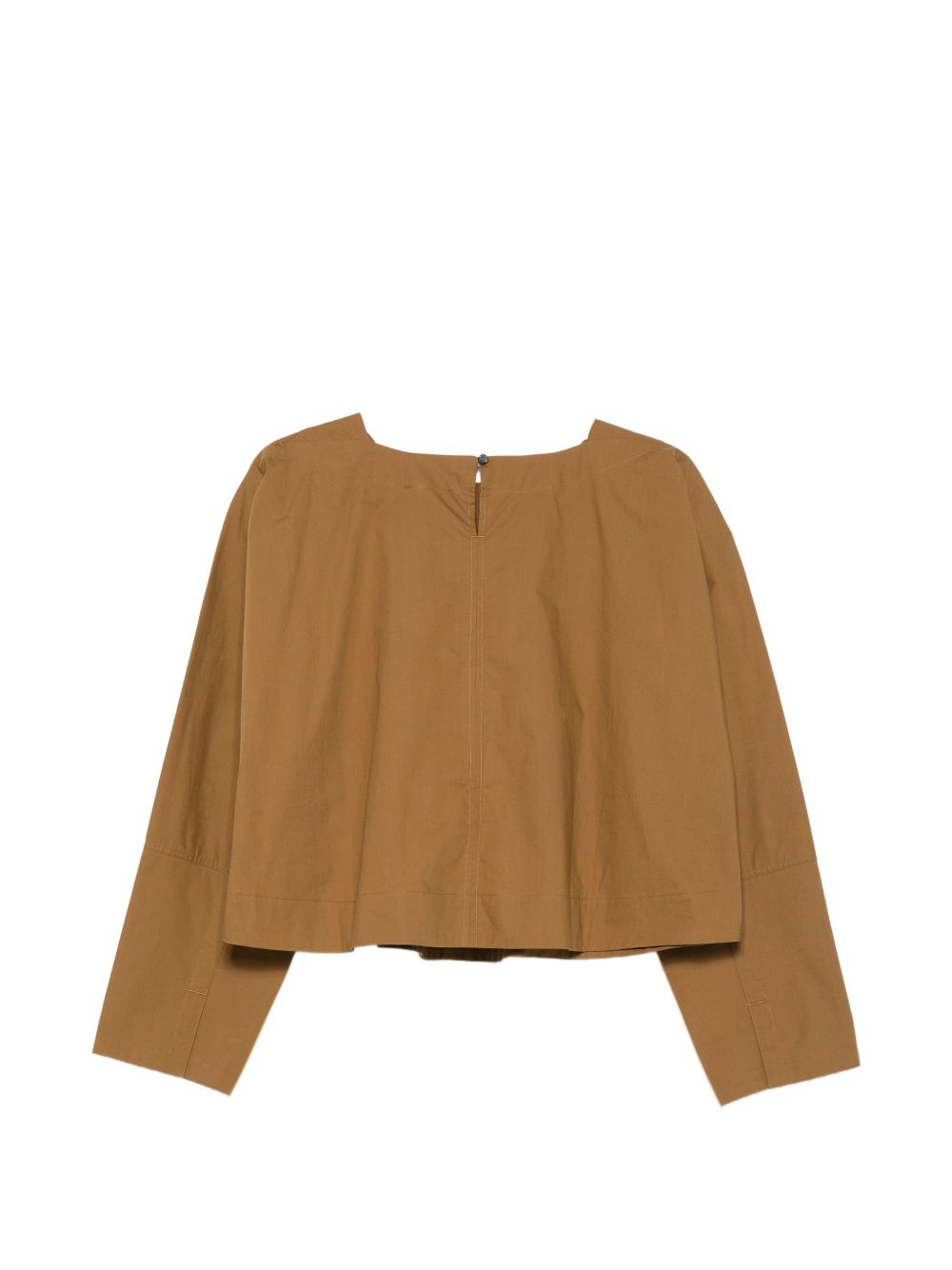 Blusa caramello Armand di Soeur in cotone con scollo rotondo, chiusura con bottone posteriore, manica corta e orlo dritto.
