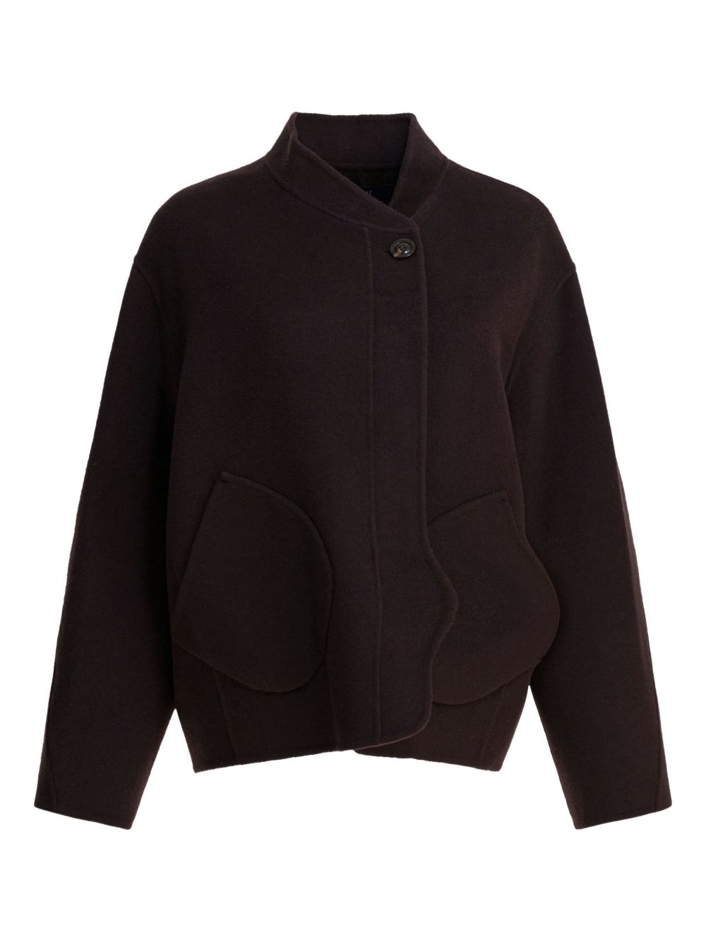 Cappotto melanzana Windsor di Soeur in lana con design senza collo, chiusura con un bottone a vista, tasche tonde e orlo dritto.