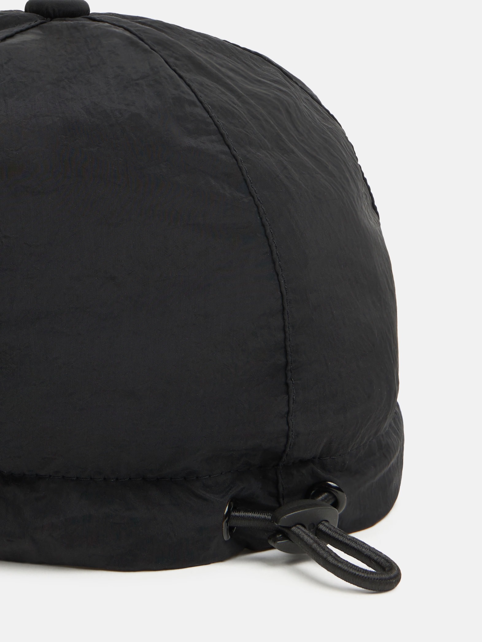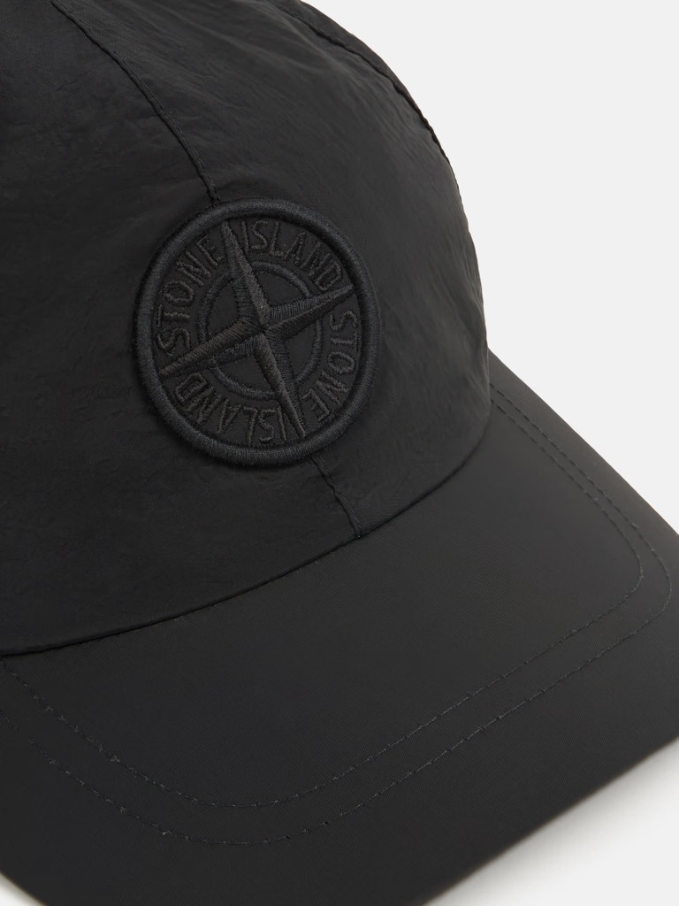 Cappello nero di Stone Island con 6 pannelli e elastico posteriore.