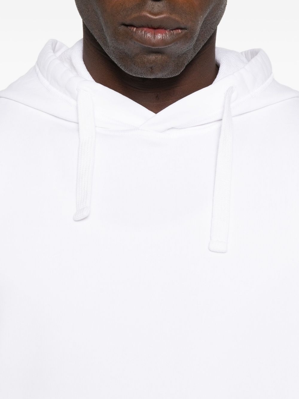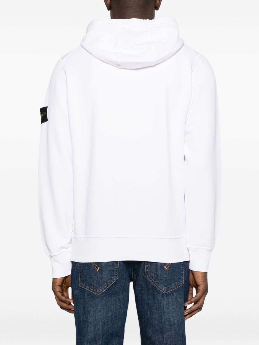 Felpa bianca di Stone Island in cotone con cappuccio con coulisse, maniche lunghe, tasca con patta sulla manica e orlo e polsini a coste.