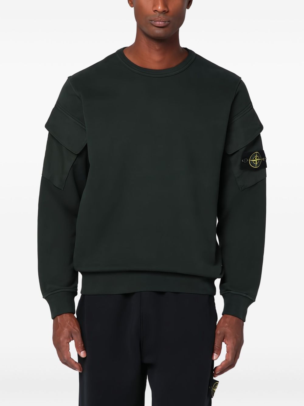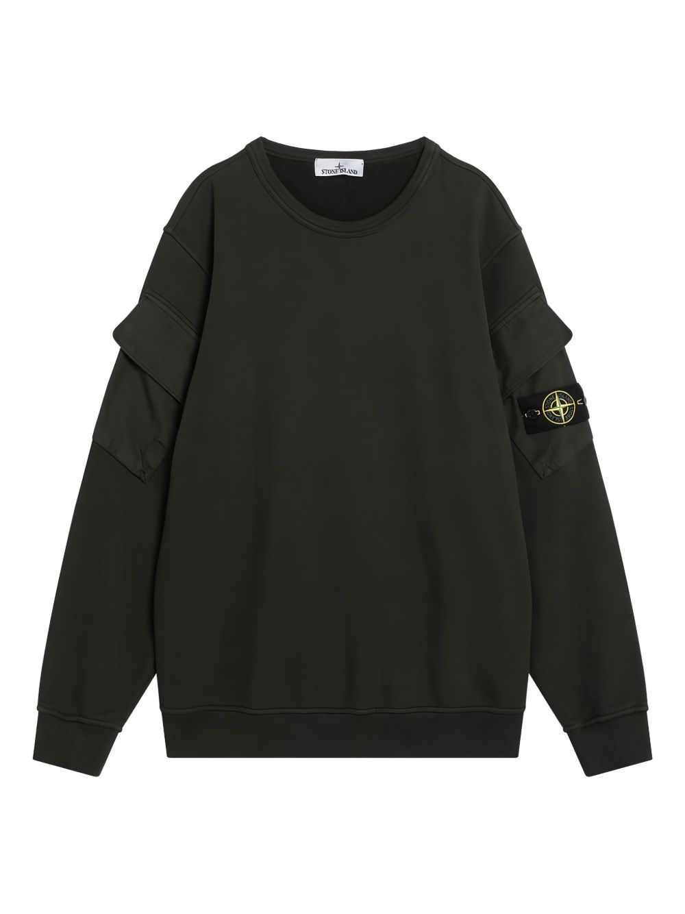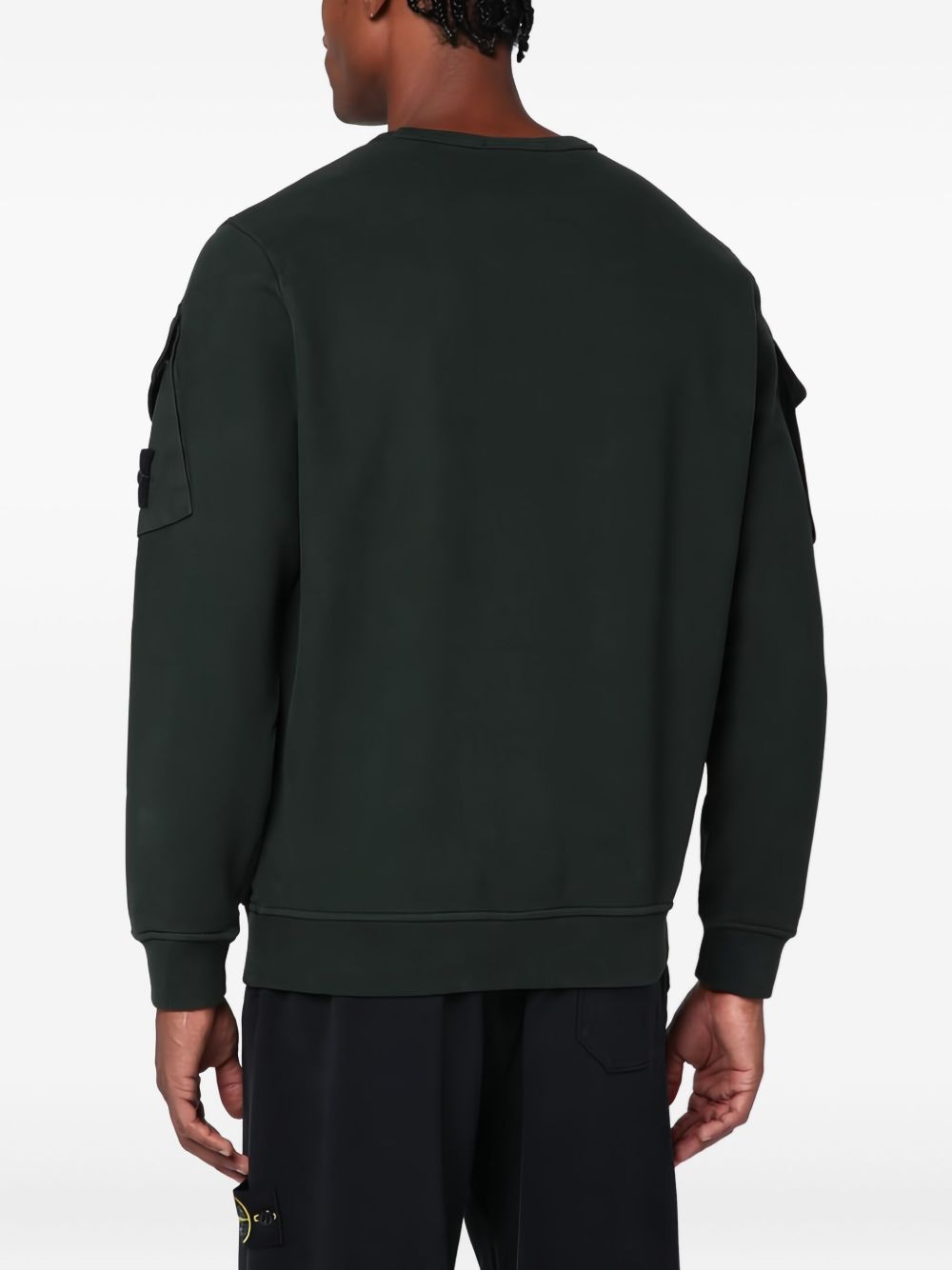 Felpa ginepro Brushed Organic Cotton Fleece di Stone Island in cotone con girocollo, maniche lunghe, tasca con patta sulla manica e orlo e polsini a coste.