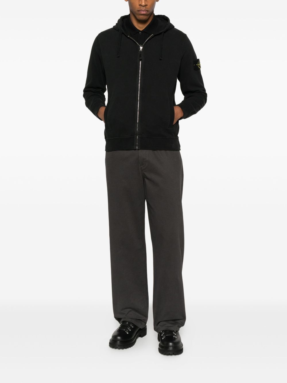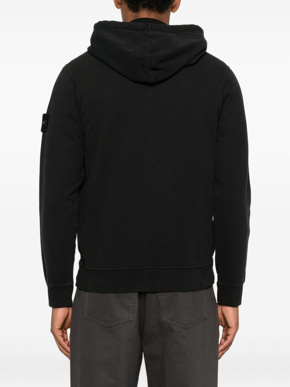 Felpa nera di Stone Island in cotone con cappuccio con coulisse, chiusura frontale con zip, maniche raglan, applicazione con logo e orlo a coste.