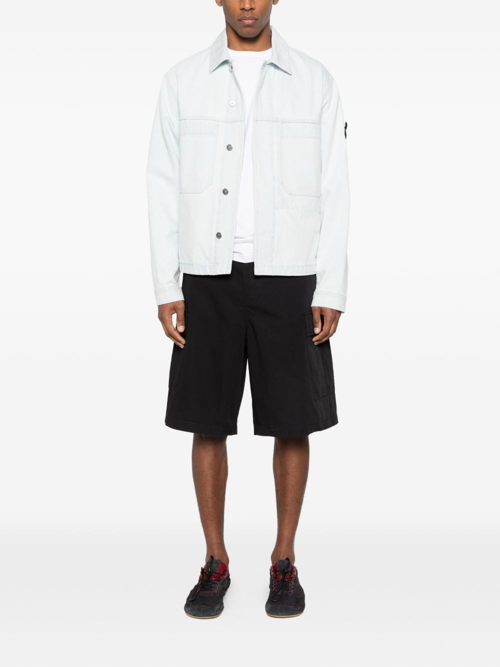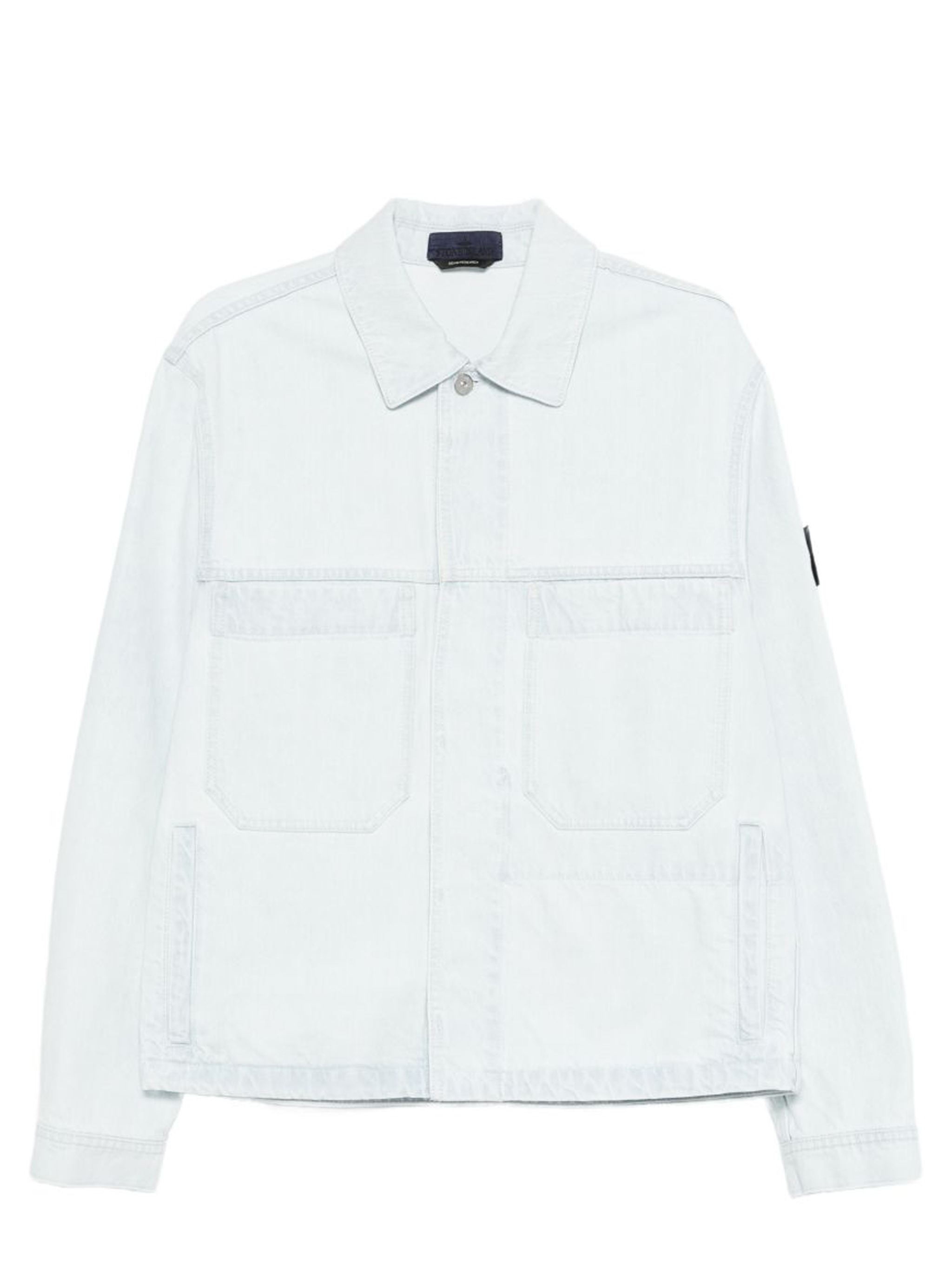 Giacca blu di Stone Island in denim di cotone con colletto classico, chiusura frontale nascosta dotata di tasche sul petto e badge Stone Island Denim Research e orlo dritto.