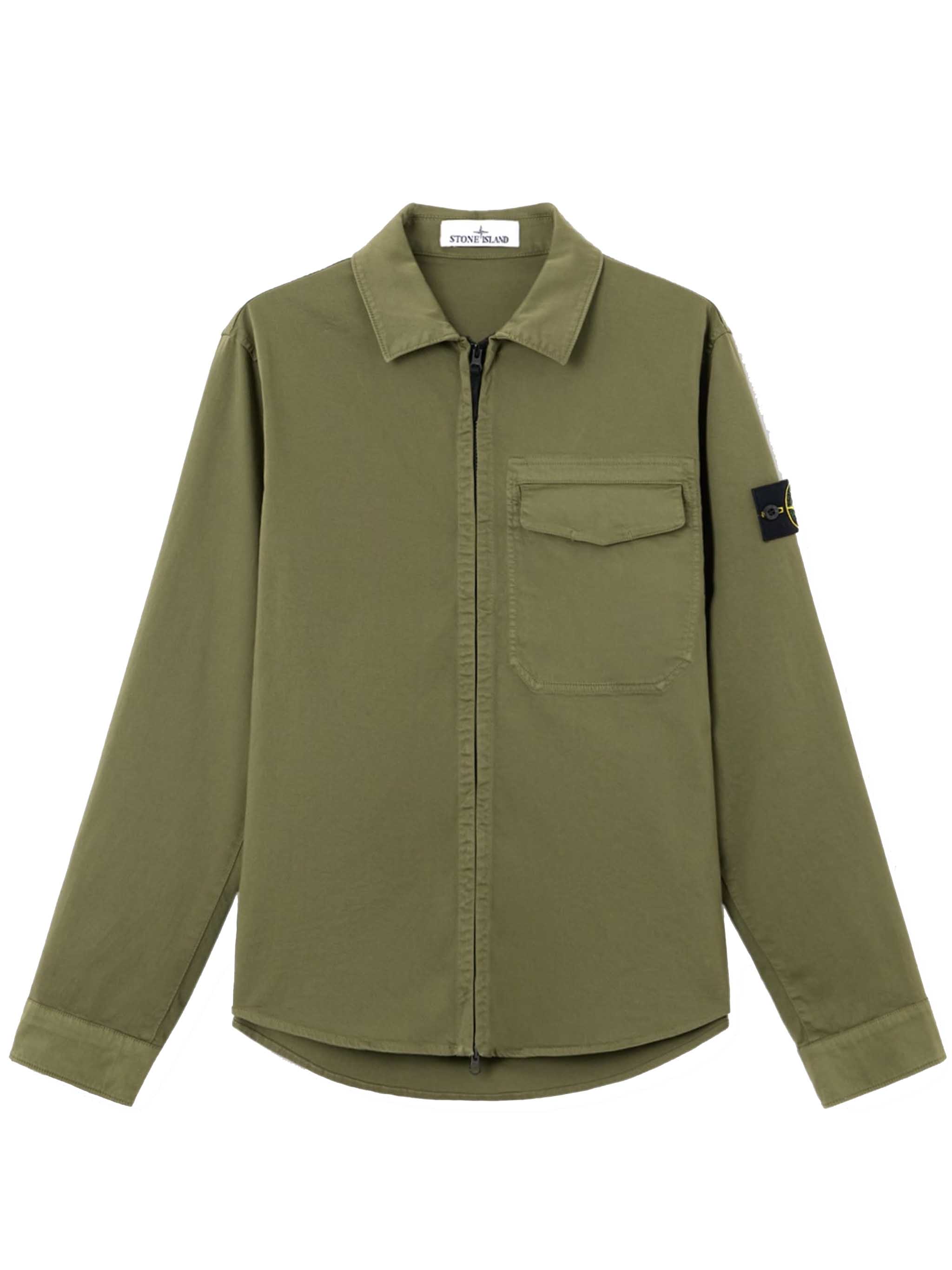 Overshirt verde militare di Stone Island in denim di cotone con colletto classico, chiusura frontale con zip, tascha sul petto, badge e orlo curvo.