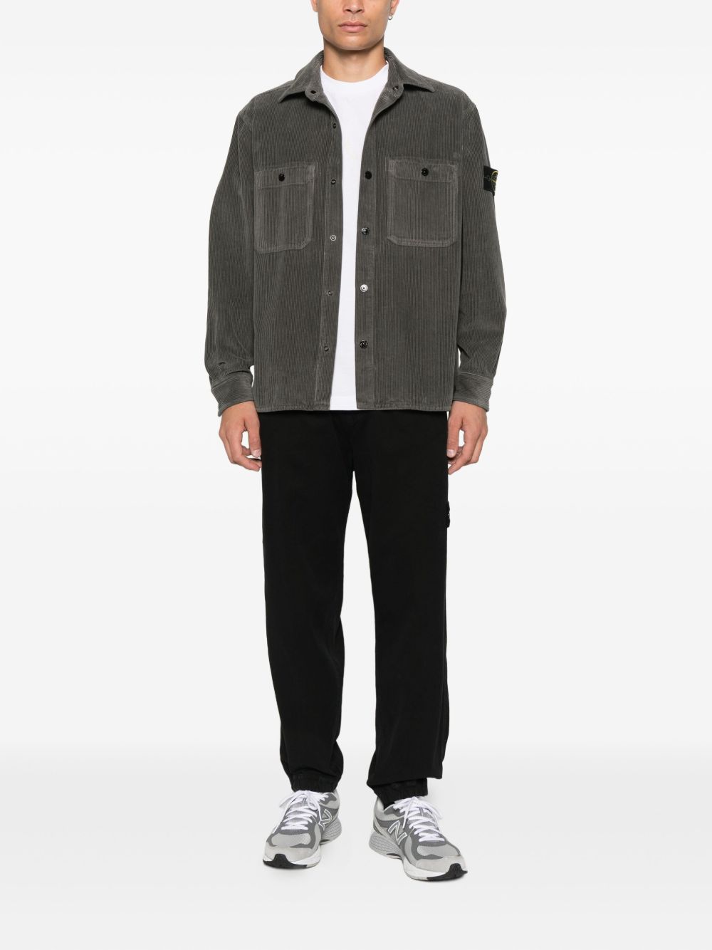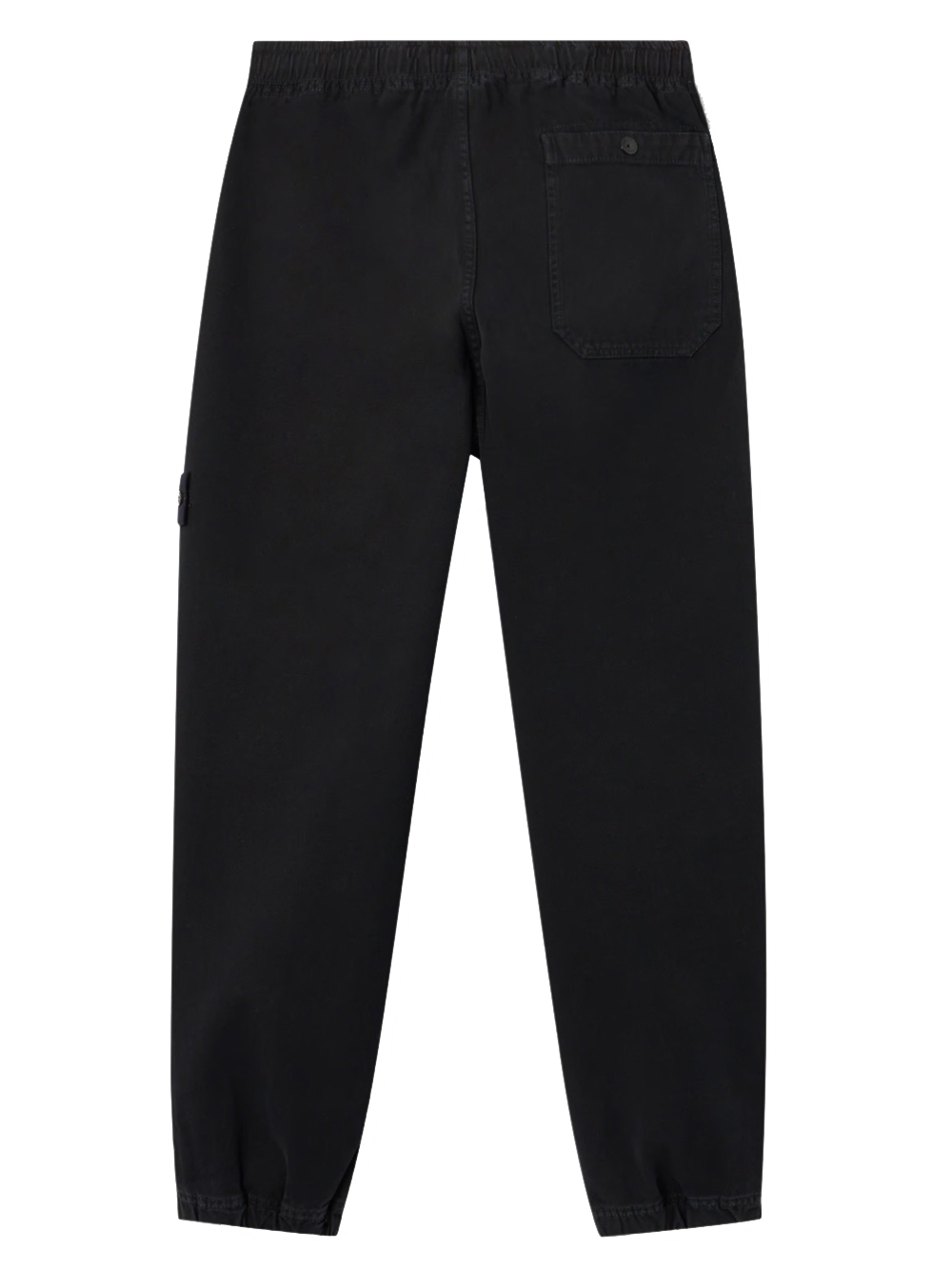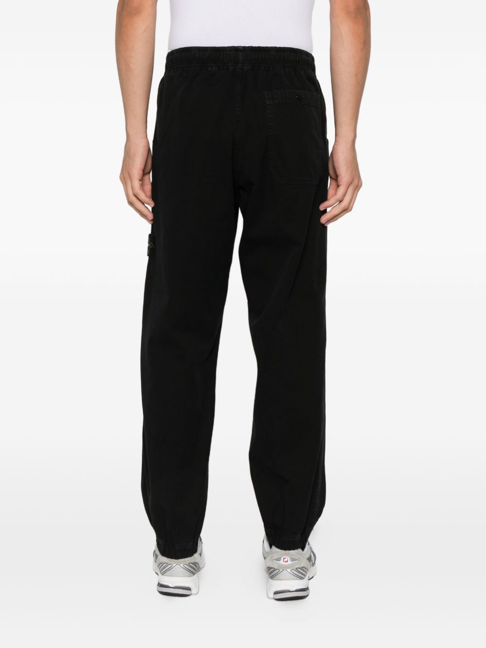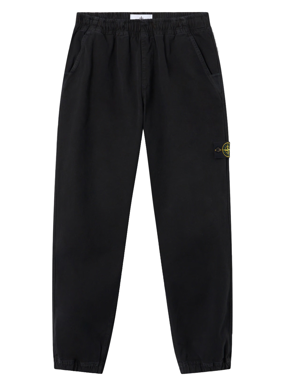 Pantaloni neri di Stone Island in cotone con vita elasticizzata, tasche laterali, 1 tasche posteriori con bottone e orlo elasticizzato.