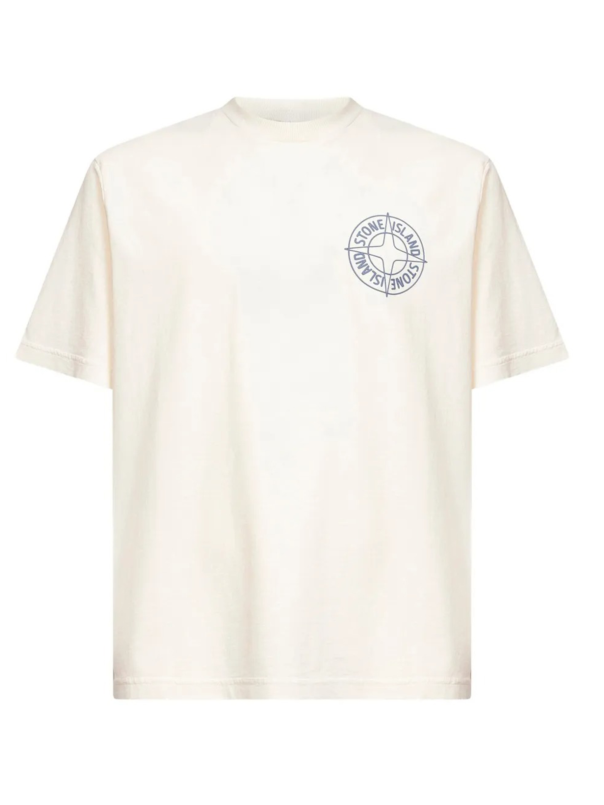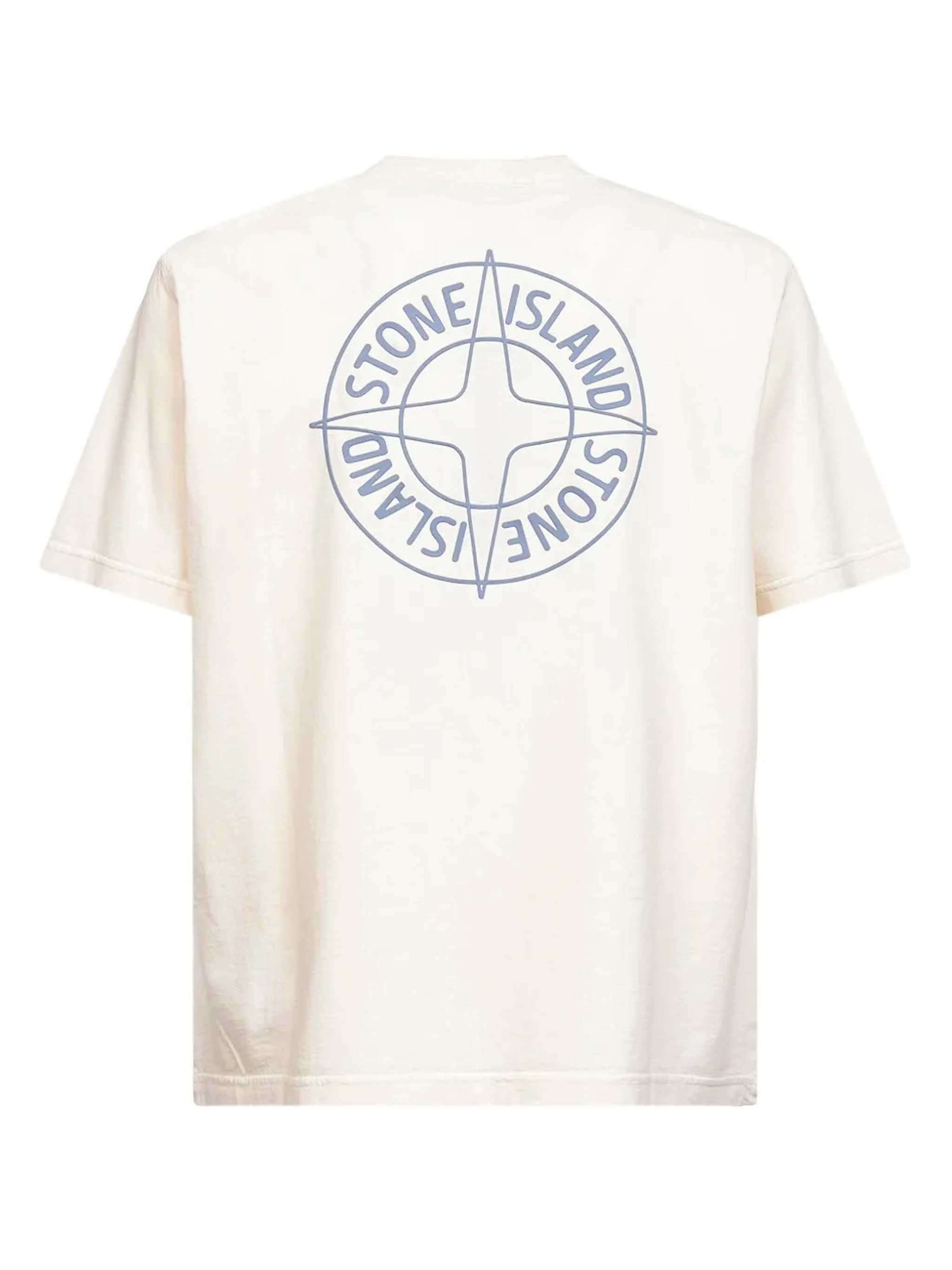 T-shirt avorio di Stone Iland in cotone con girocollo, stampa frontale e posteriore, manica corta e orlo dritto.