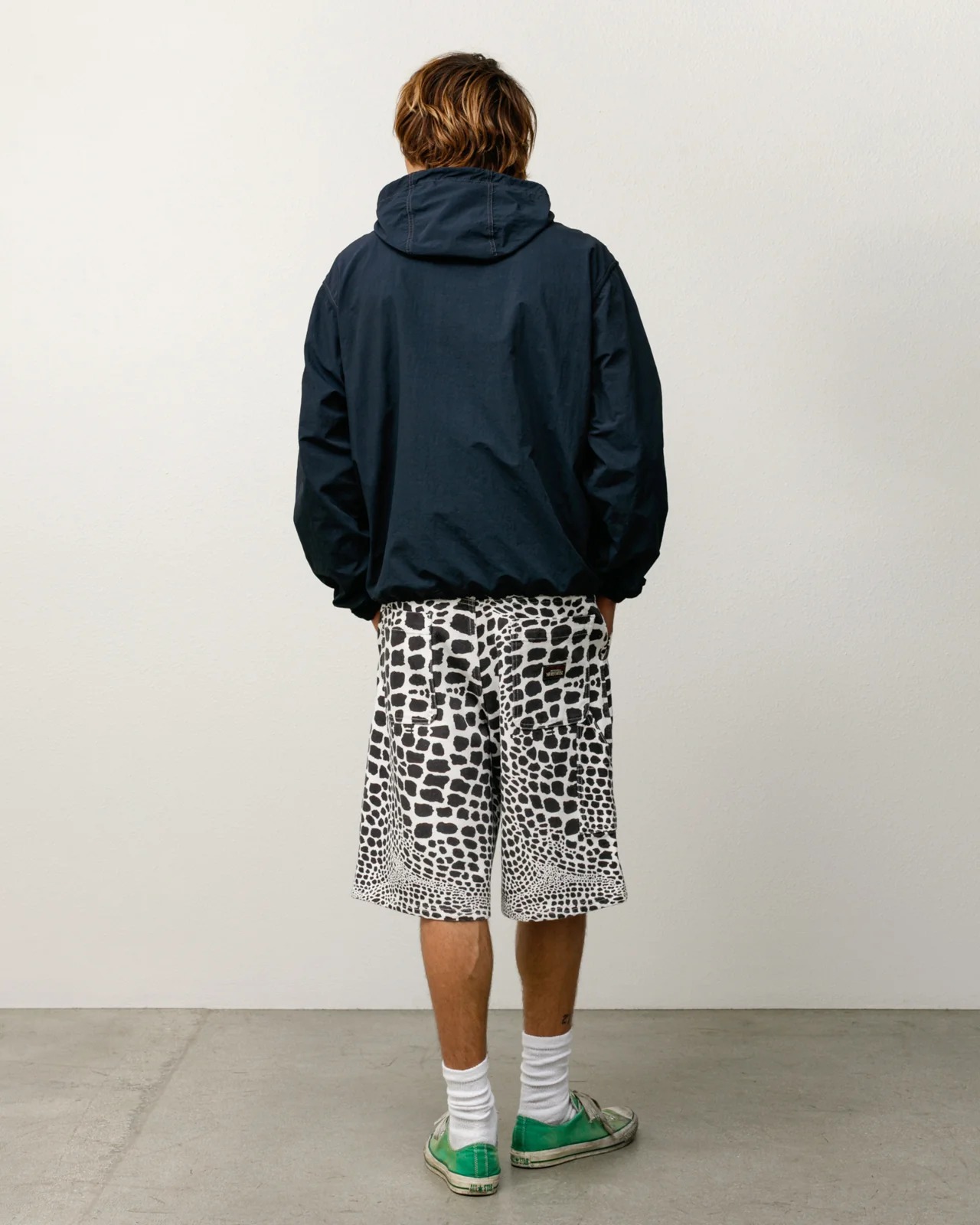 Pantaloncini larghi in tela di cotone lavata da 520 g/m², vestibilità ampia con vita bassa, accessori in nichel con marchio, chiusura con bottone e patta con cerniera, tasche laterali oblique con taschino portamonete, tasca multiuso sulla coscia, tasche applicate posteriori, etichetta "Authentic Workgear" di Stüssy sulla tasca posteriore.