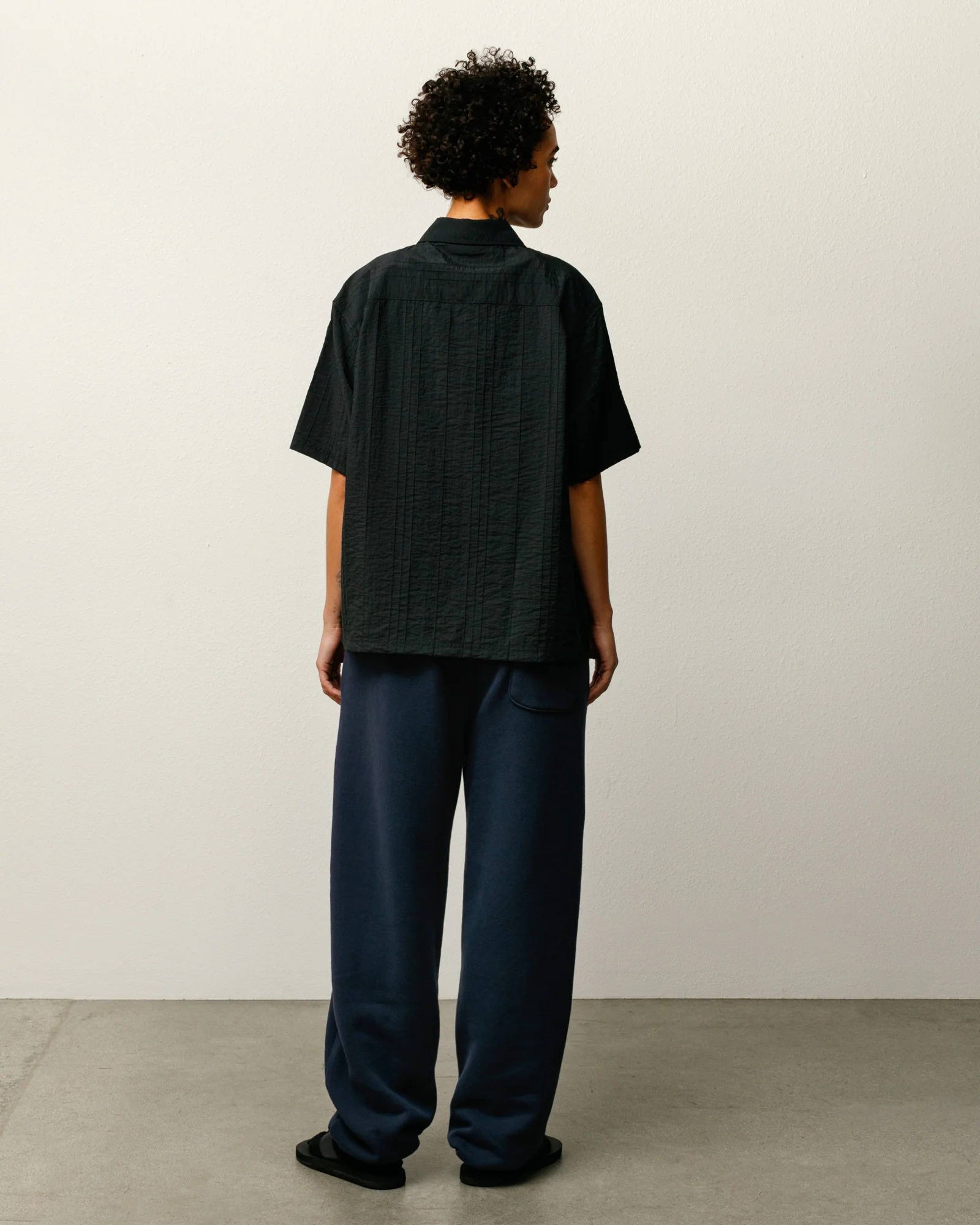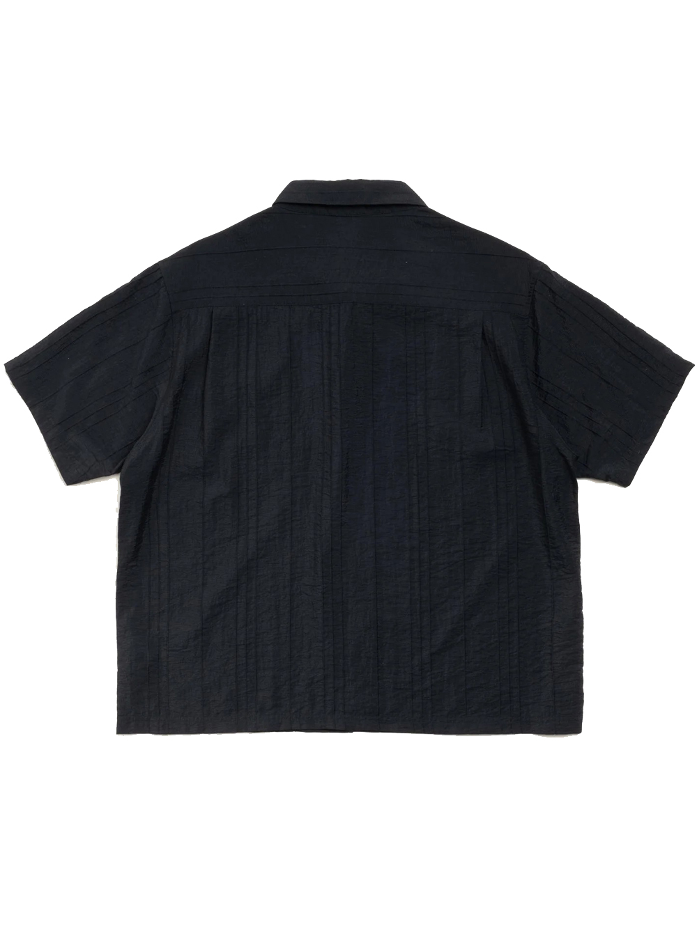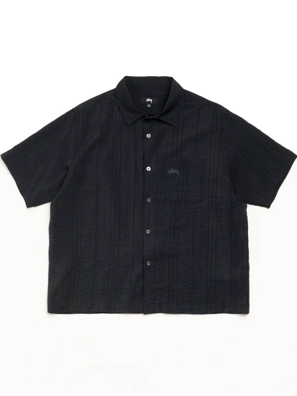 Camicia dal taglio squadrato con effetto plissettato, maniche corte, chiusura con bottoni in madreperla, dettagli con impunture, tasca applicata con ricamo del logo, stüssy in tono su tono, carré posteriore plissettato e orlo dritto.