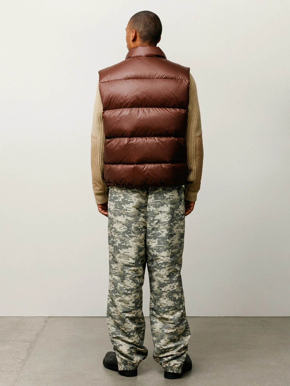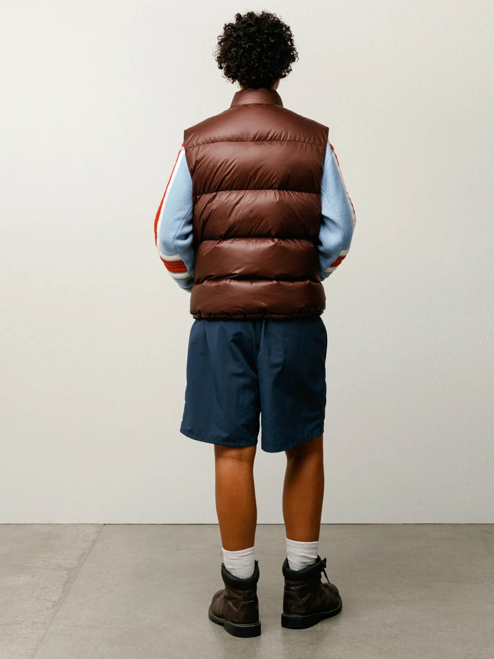 Gilet imbottito dal taglio classico con collo alto in nylon micro ripstop, imbottitura in piuma trapuntata 800 fill, chiusura con zip YKK in metallo, logo Stüssy basic ricamato sul petto, tasche con bordi in lycra e chiusura con zip nascosta, pattina antivento interna, tasca interna verticale con zip, tasche interne in rete.