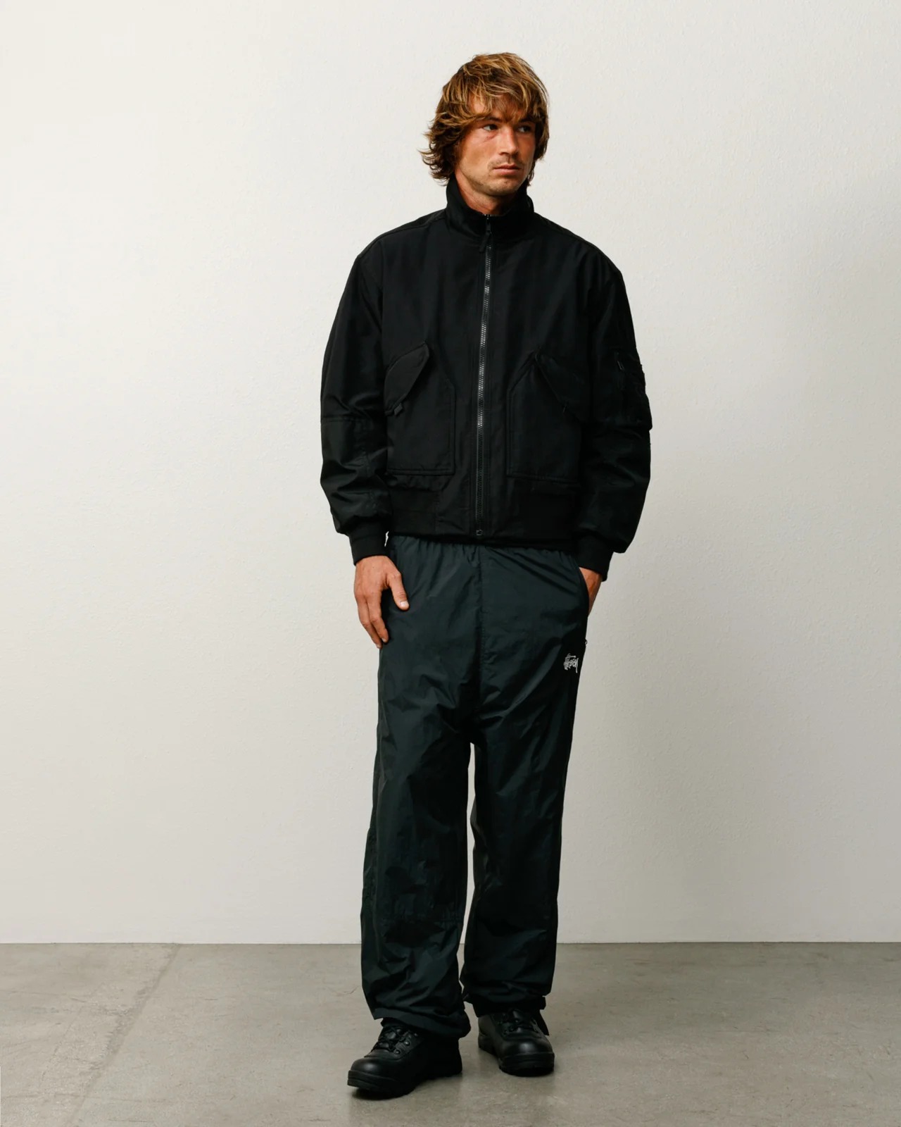 Pantaloni da tuta dalla vestibilità comoda, nylon leggero con fodera in rete, vita elasticizzata con cordino, tasche verticali con cerniera a filetto, ricamo del logo Stüssy Basic Stock, dettagli sui pannelli laterali, polsini elasticizzati con cerniere laterali, tasca posteriore con cerniera a filetto.