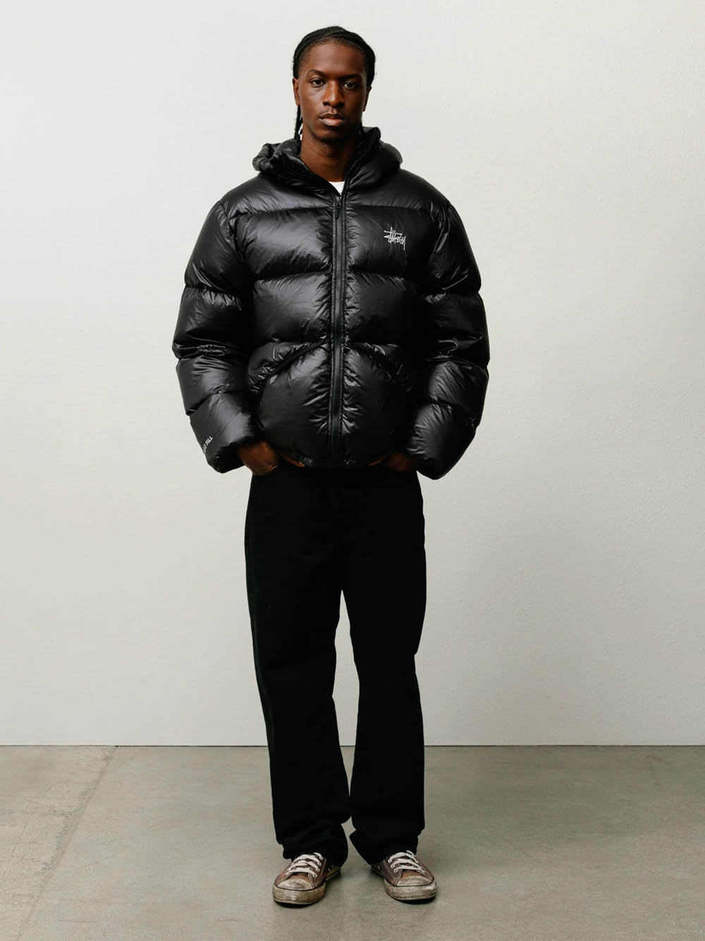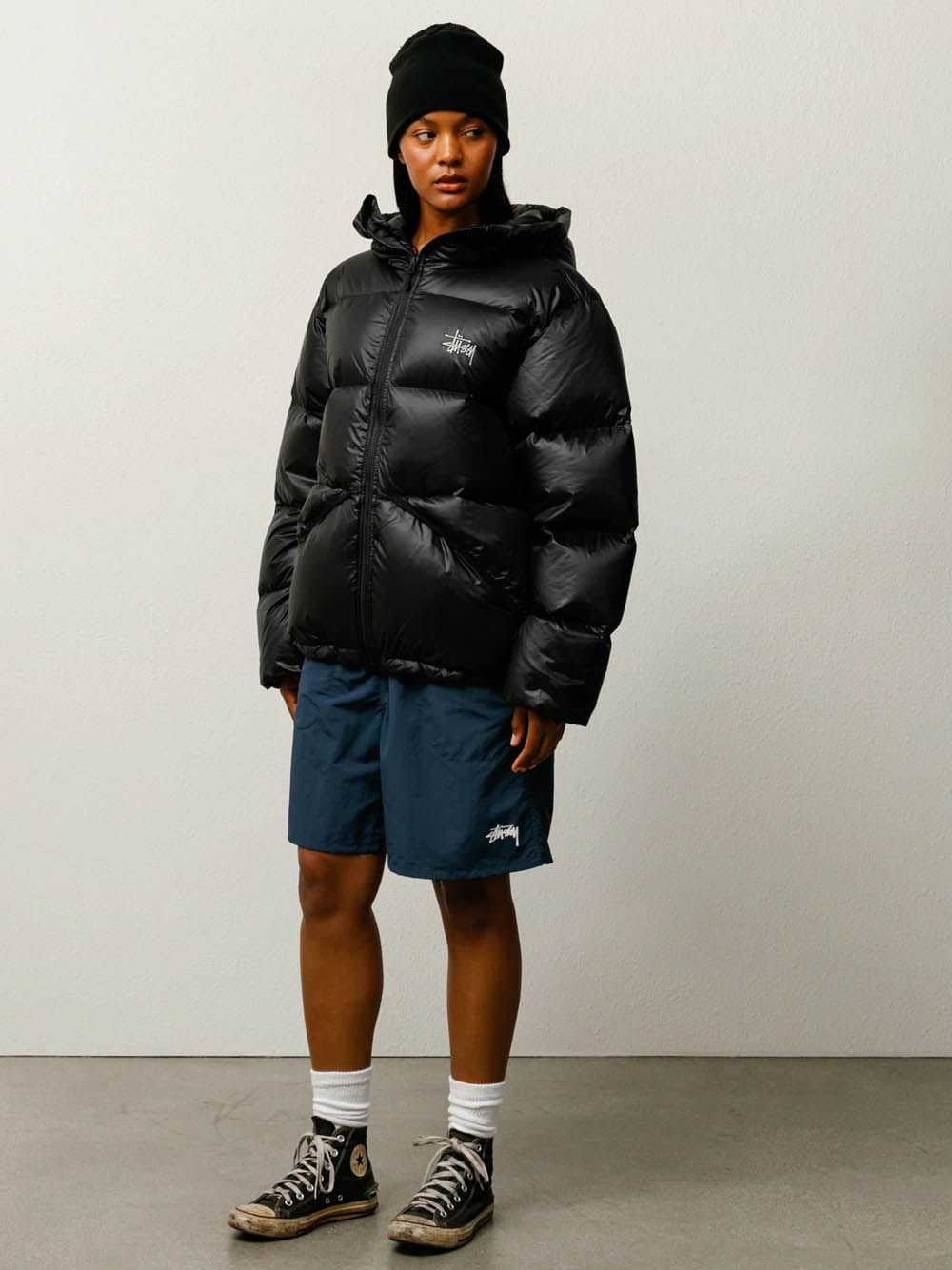 Parka con cappuccio, imbottitura in piuma trapuntata 800 fill. cordini regolabili sul cappuccio e sull'orlo, chiusura con zip YKK VISLON®, logo Stüssy basic ricamato sul petto, tasche con bordi in lycra e chiusura con zip nascosta, polsini elasticizzati, fodera nello stesso tessuto, tasca interna sul petto con zip, e tasche interne in rete.