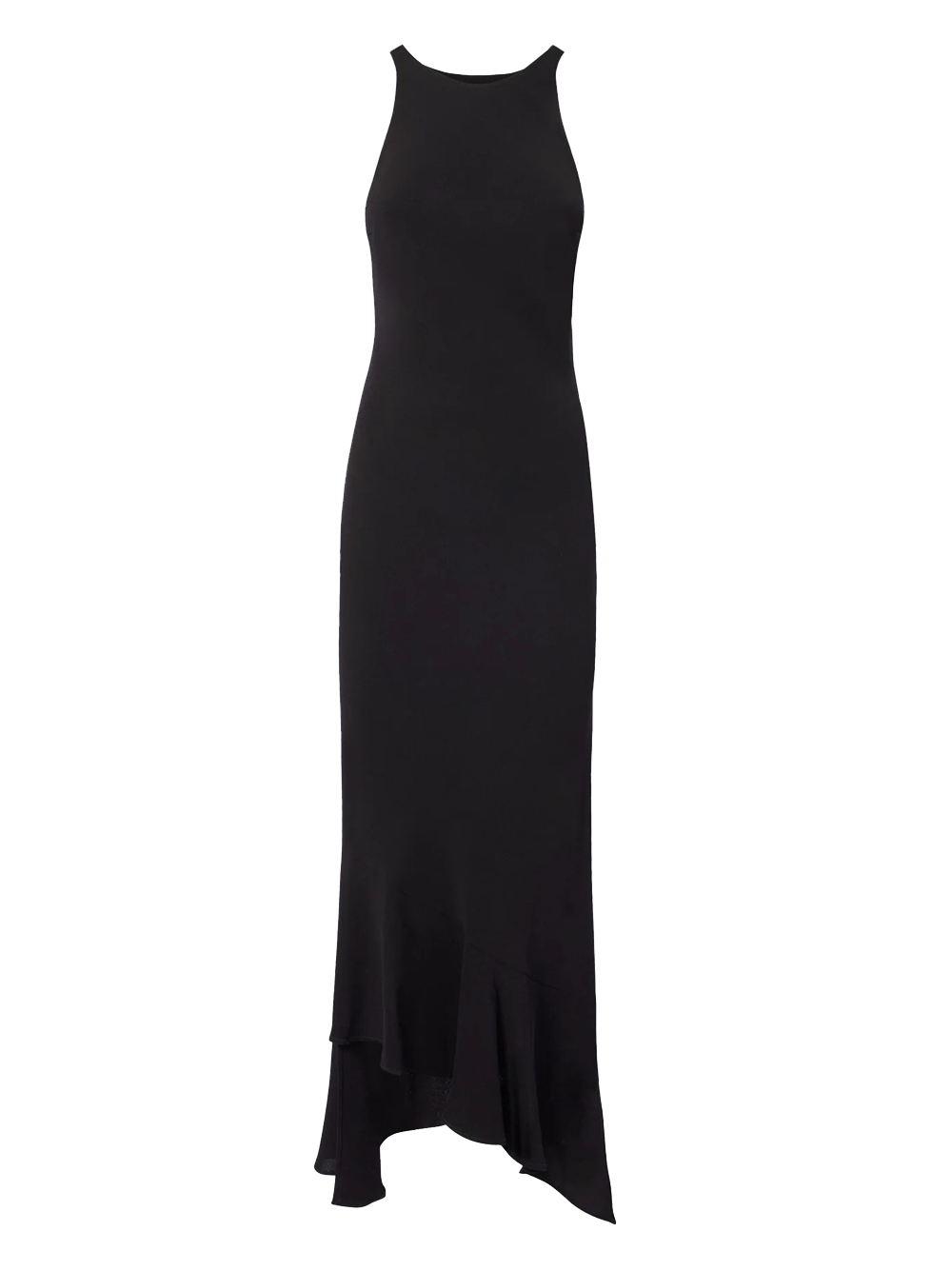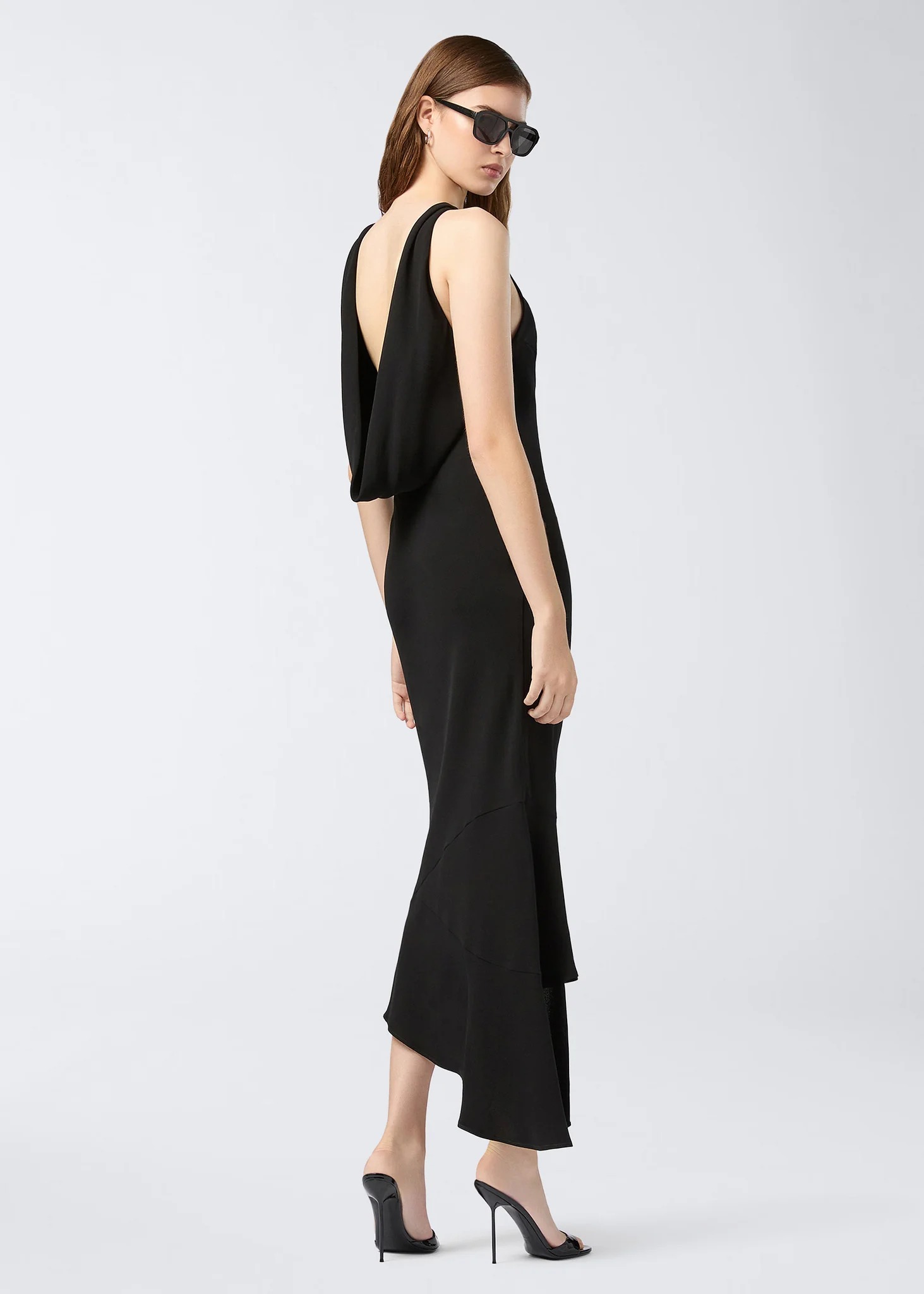 Abito midi nero Cramen di The Andamane in polistere poliestere con scollo a bara , schiena scoperta e drappeggio sul fondo.