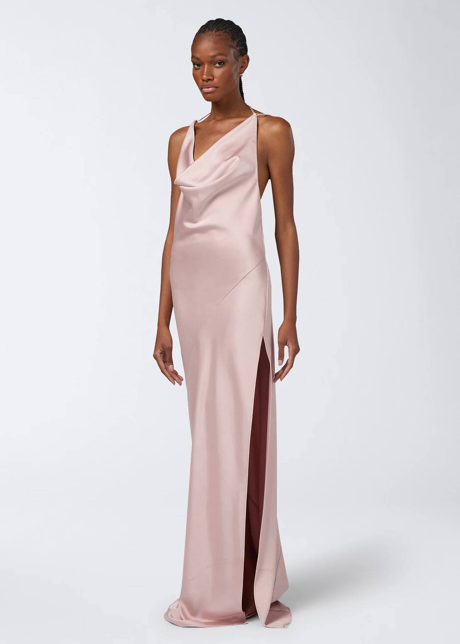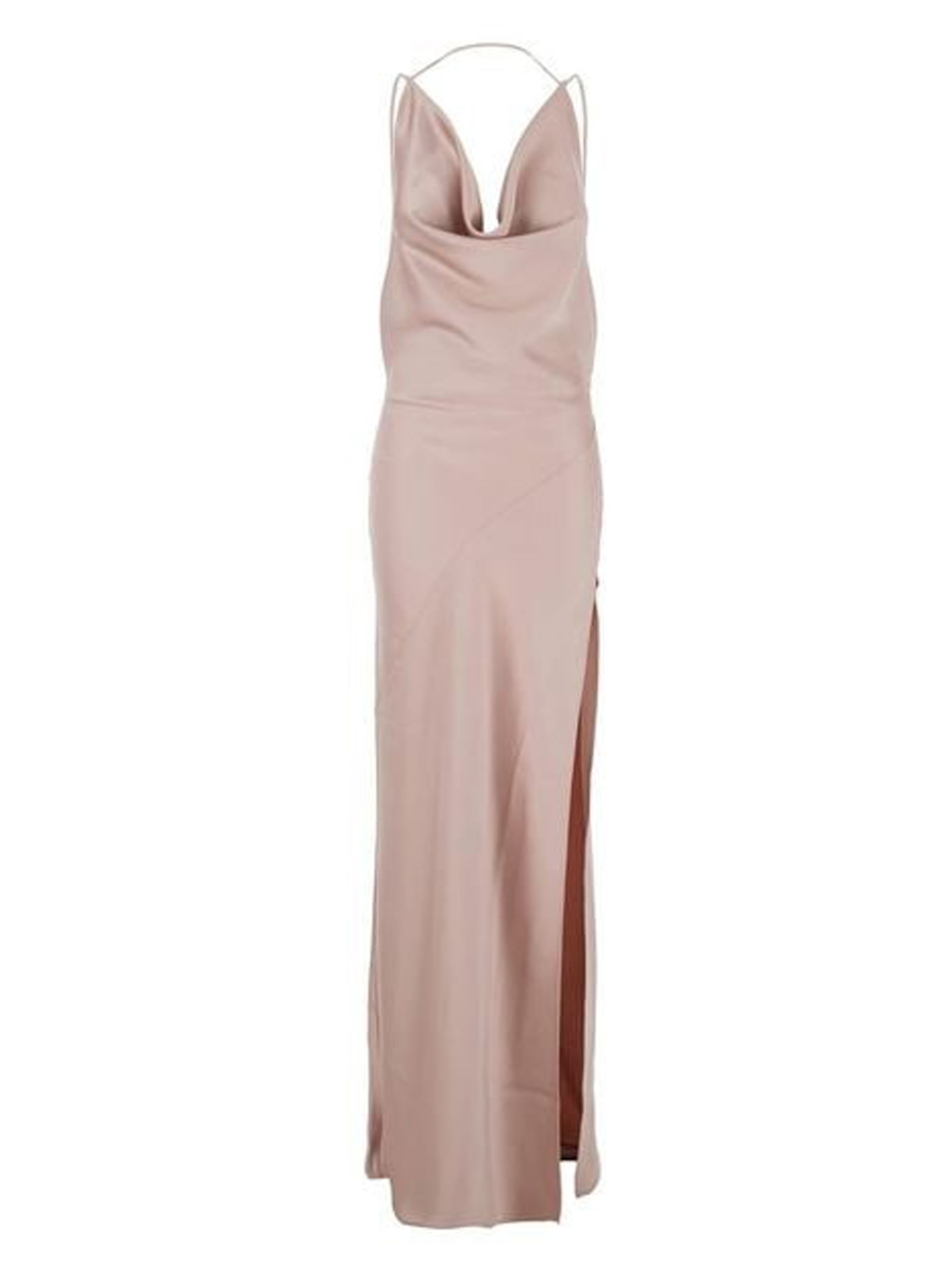 Maxi abito rosa di The Andamane in poliestere con collo borbido, chiena scoperta e spacco laterale.