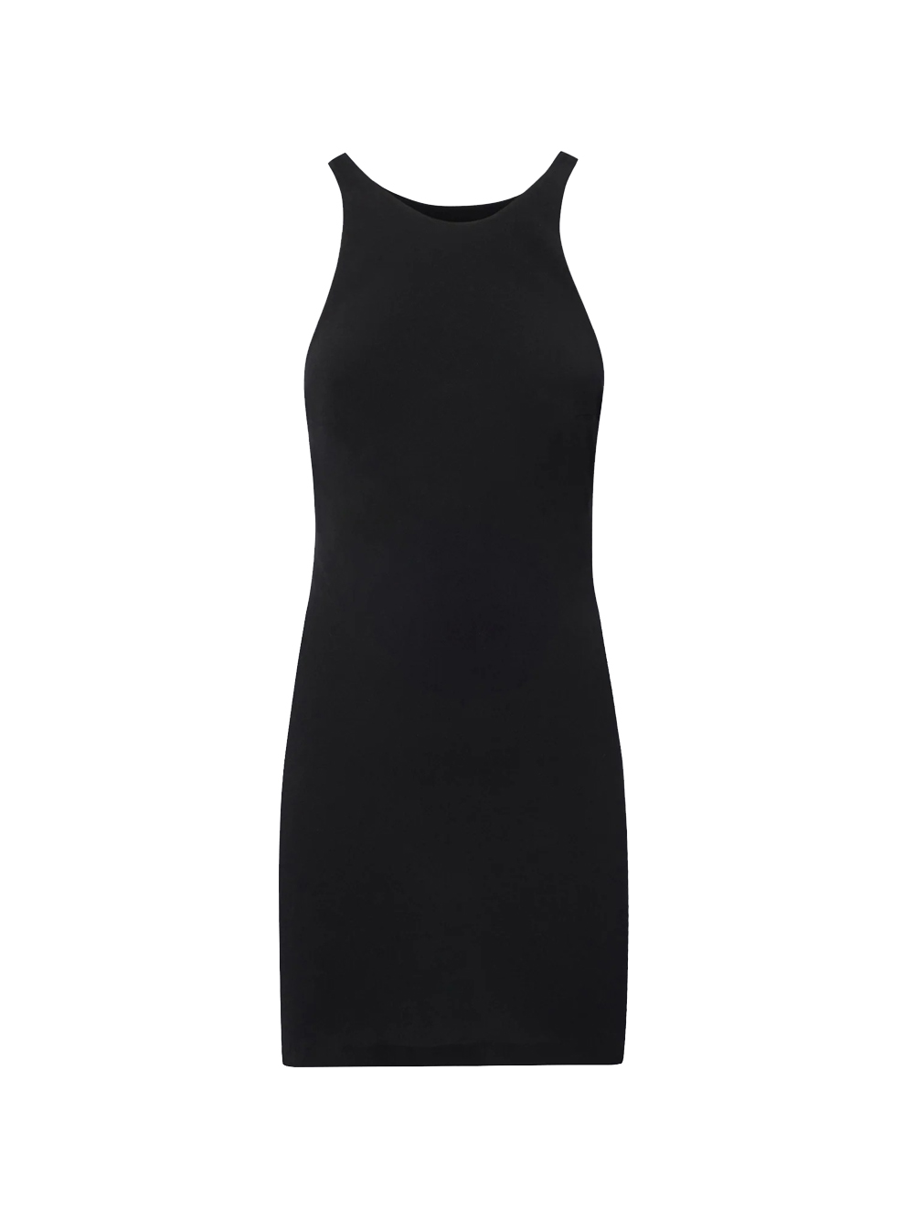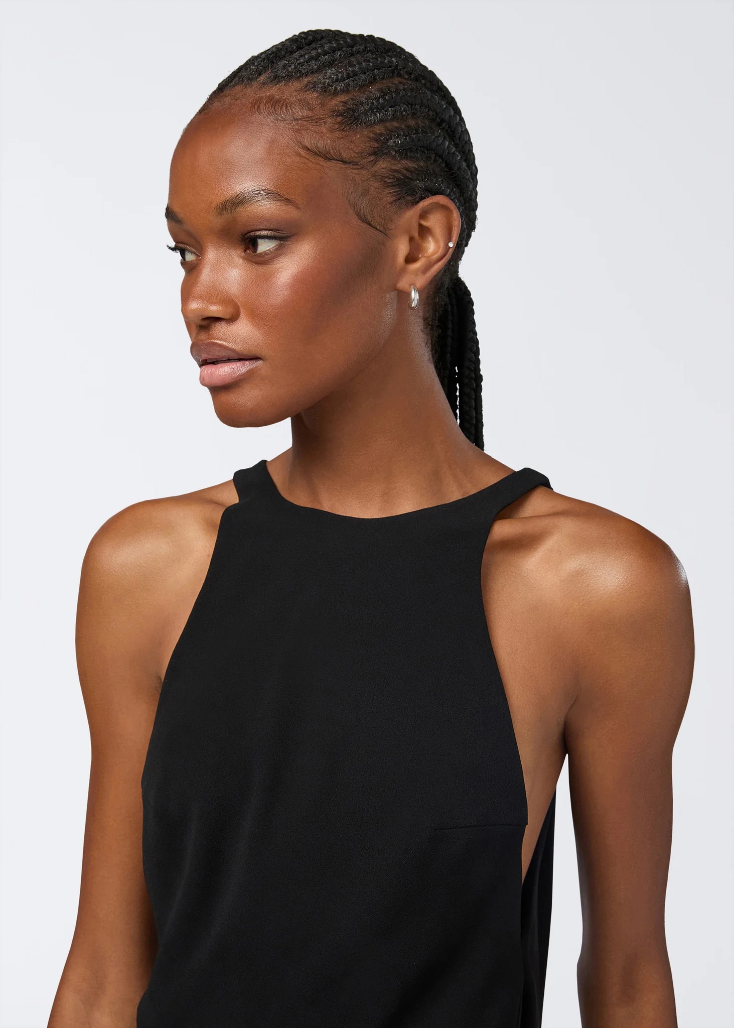 Mini abito nero Carmen di The Andamane in poliestere con scollo a bara , schiena scoperta e drappeggio sul fondo.