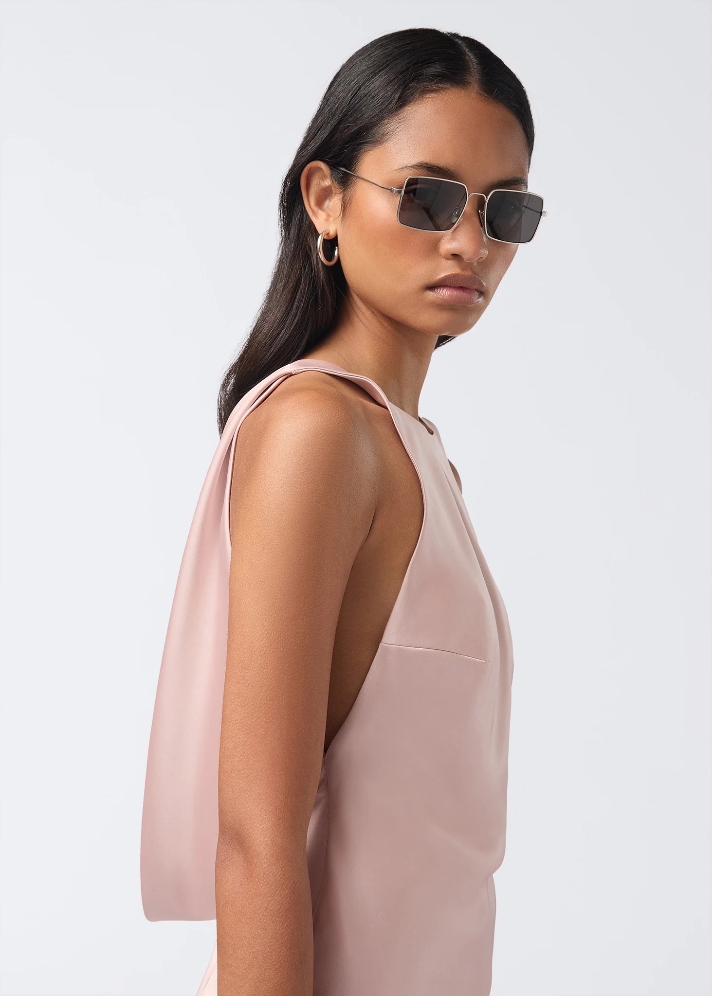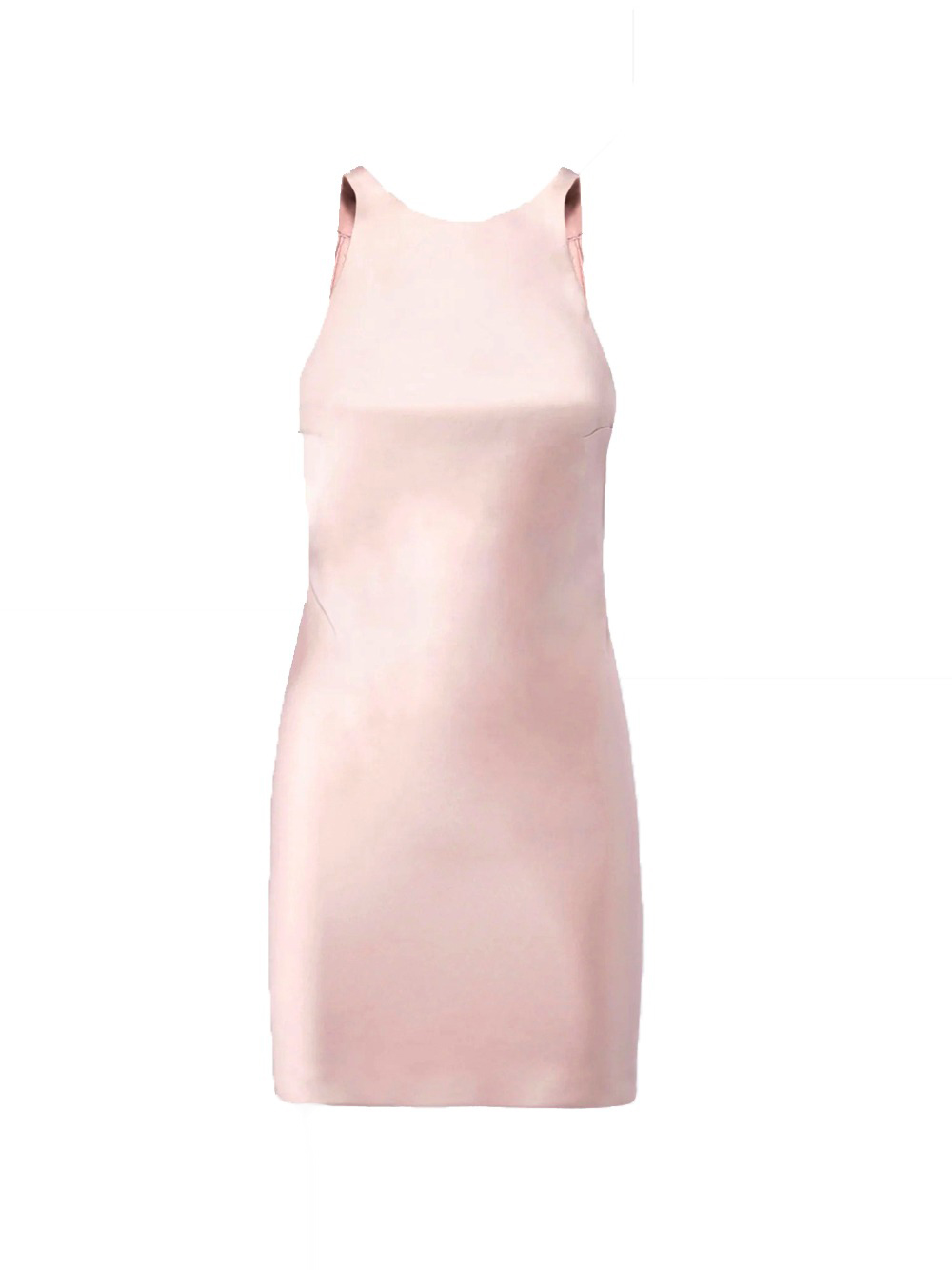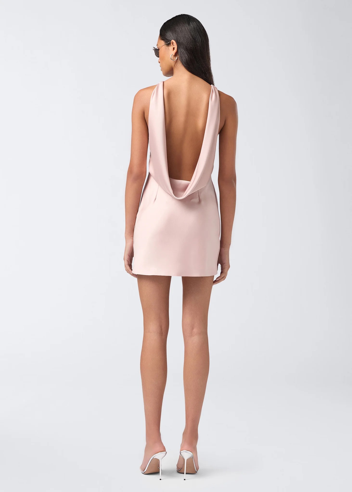 Mini abito rosa Carmen di The Andamane in poliestere con scollo a bara , schiena scoperta e drappeggio sul fondo.