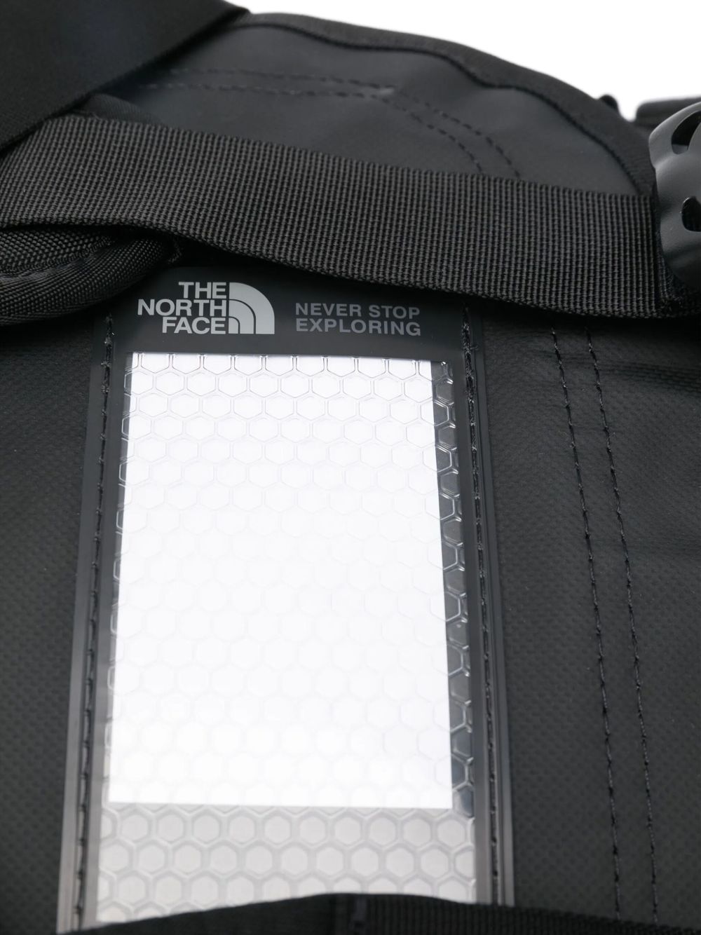 Borsone nero Base Camp Duffel - M di The North Face in poliestere riciclato con design strutturato, manici superiori, spallacci regolabili, scomparto con separatore interno, tasca in rete e finitura idrorepellente.