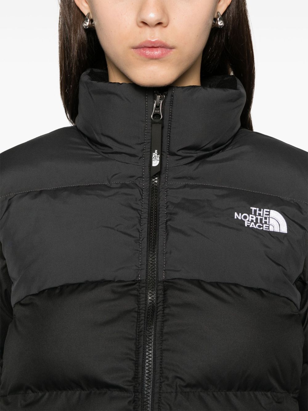 Giacca nera Saikuru Cropped di The North Face in poliestere con collo alto, chiusura frontale con zip, tasche laterali con zip, logo ricamato sul petto e sul retro e orlo dritto.