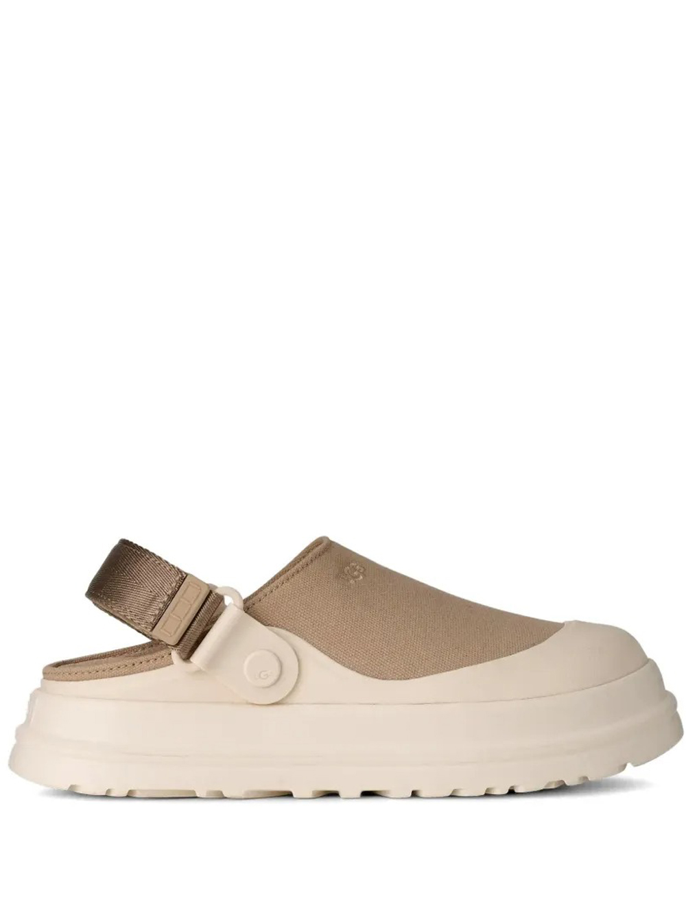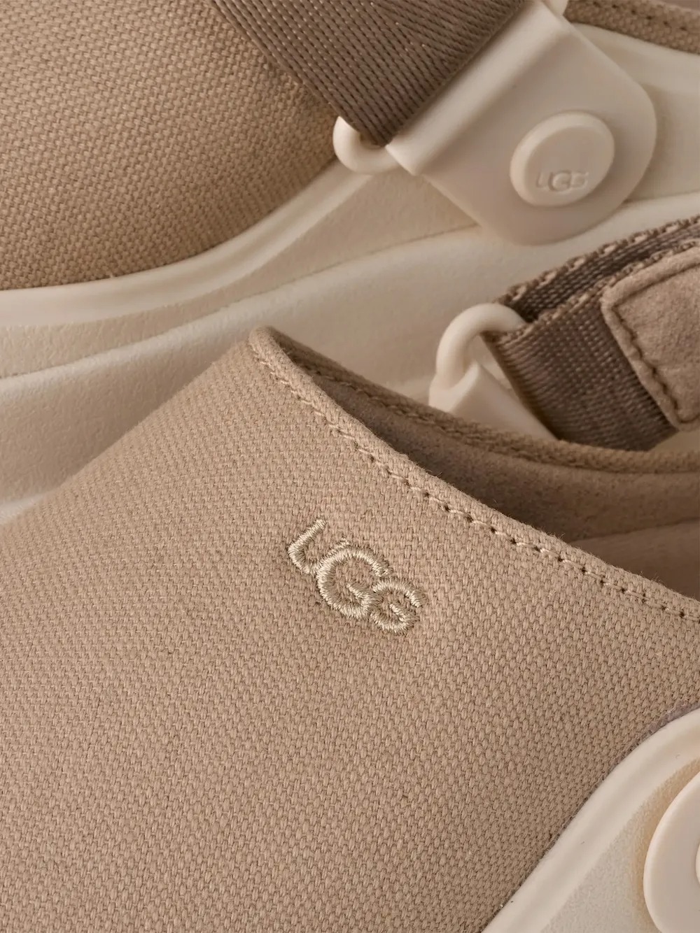 Sabot beige GoldenGlow di UGG in poliestre con suola in gomma, tomaia in tela e dettaglio con cinghia.