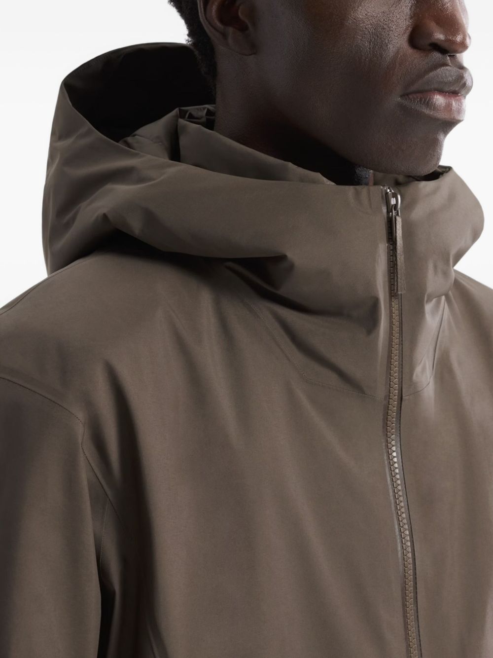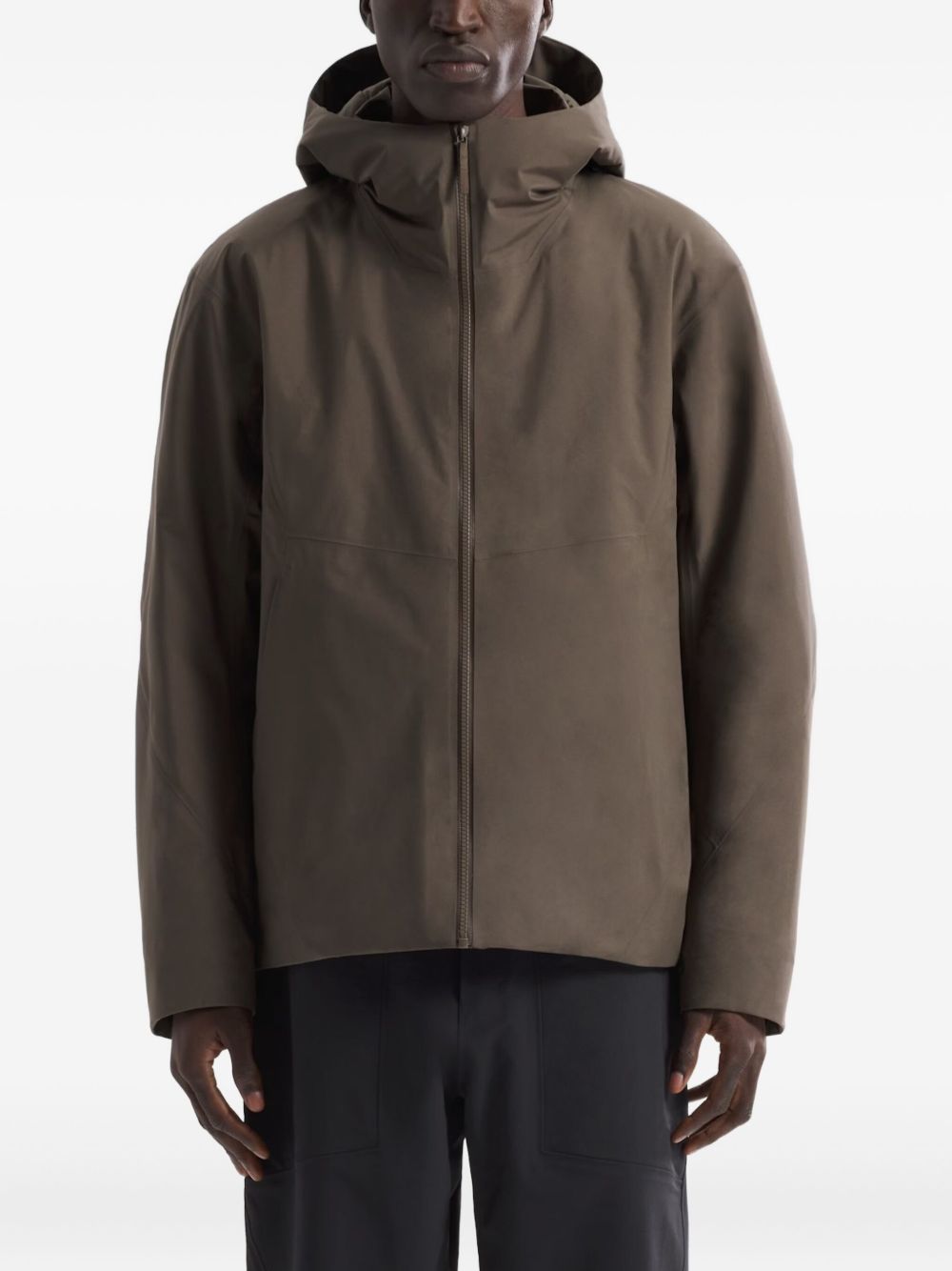 Giacca marrone chiaro Dionde Insulated di Veilance cin cappuccio, chiusura frontale con zip, tasche laterali e orlo dritto.