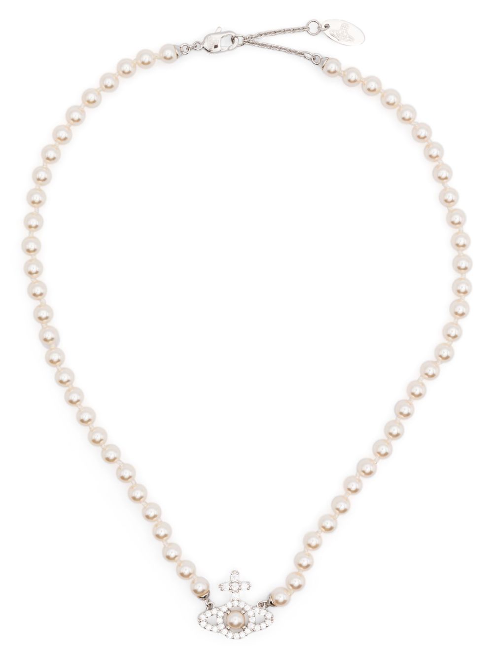 Collana platino Olympia Pearl di Vivienne Westwood in ottone con catena in perle, pendente con dettagli in brillantini e chiusura posteriore con gancio.